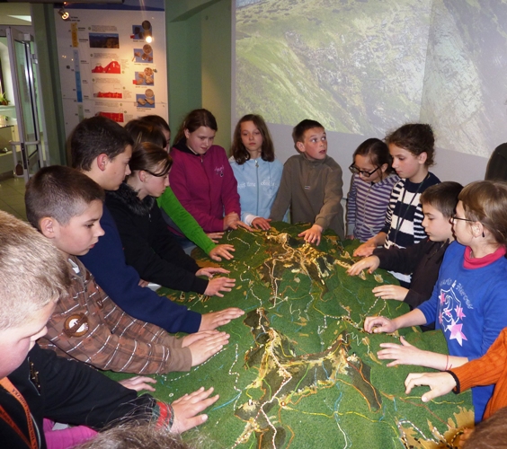 Karkonoskie Centrum Edukacji Ekologicznej w Szklarskiej Porębie - makieta Karkonoszy z naniesionymi szlakami turystycznymi, zabudowaniami i granicą państwa.