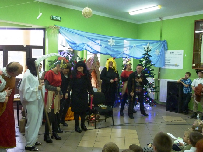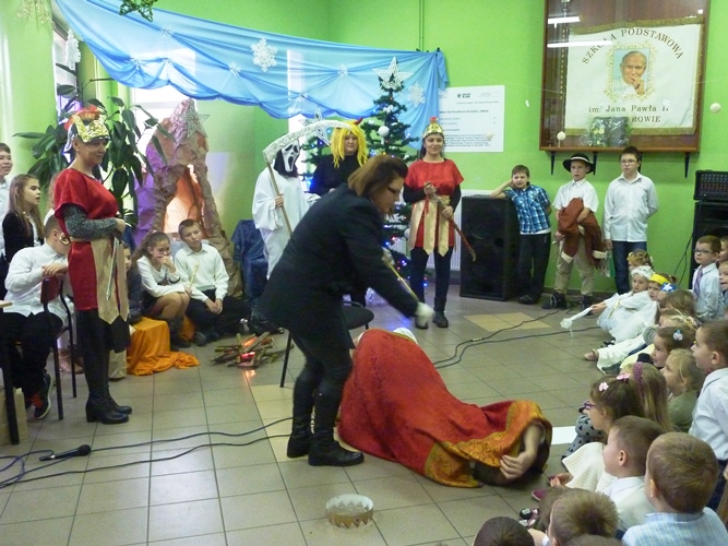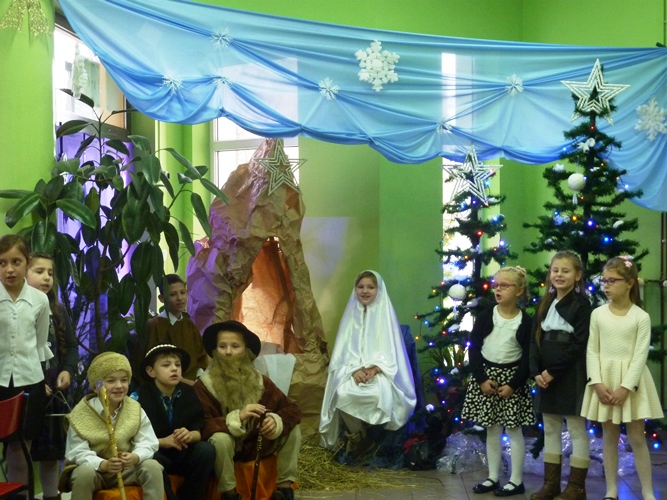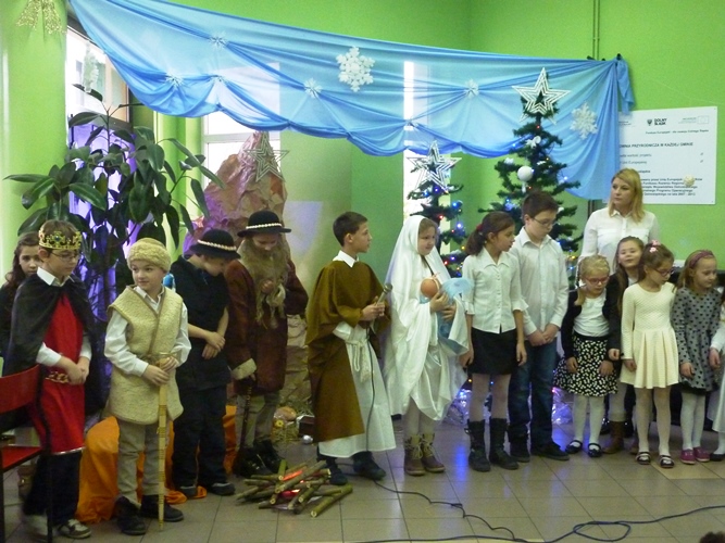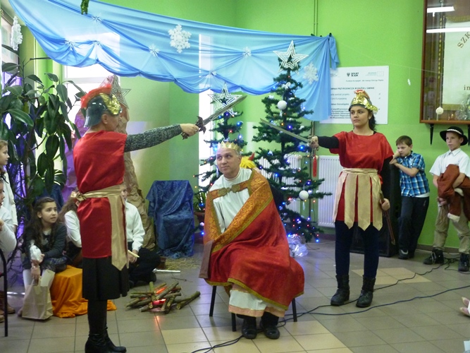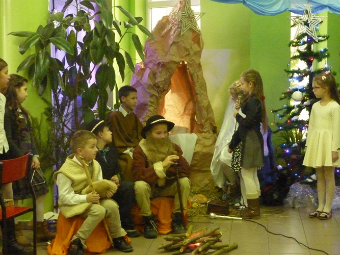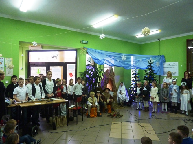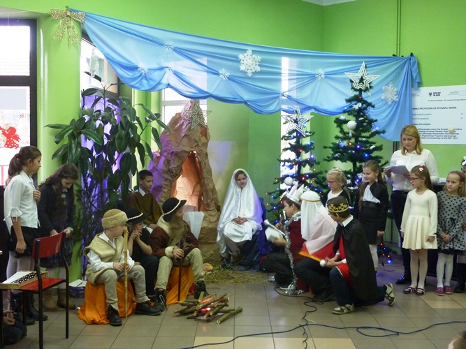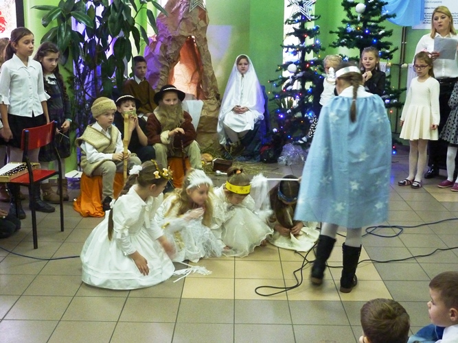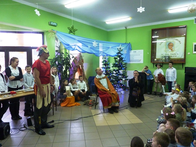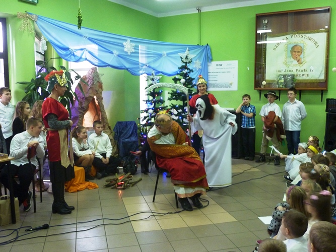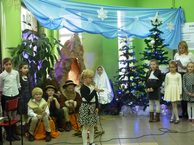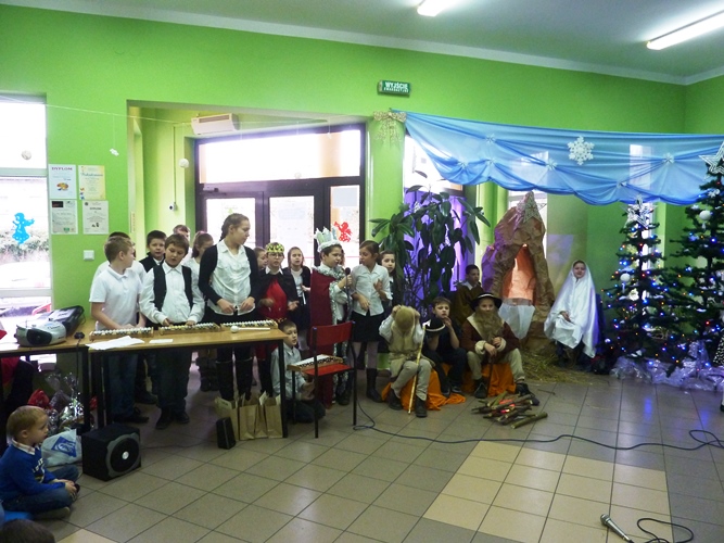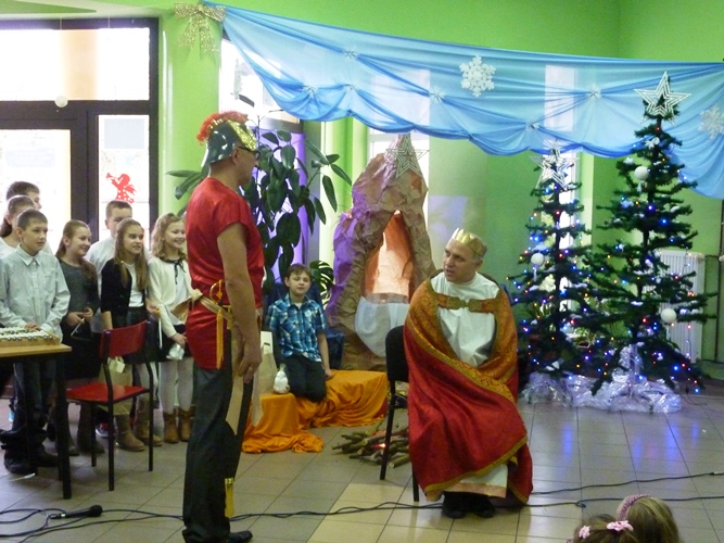 19 grudnia wszyscy mogliśmy poczuć w szkole klimat zbliżających się Świąt Bożego Narodzenia. A to za sprawą jasełek wystawionych przez młodszych uczniów pod kierunkiem p. A. Jankowskiej i p. I. Zięciowskiej oraz przedstawienia "Herody" w wykonaniu nauczycieli i rodziców uczniów naszej szkoły. Swój udział w uroczystościach mieli także uczniowie klas IV i V, którzy zagrali i zaśpiewali kilka pięknych polskich kolęd (przygotowanie - p. A. Hołomejko).