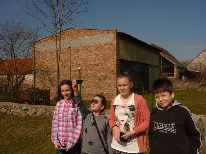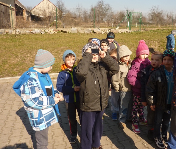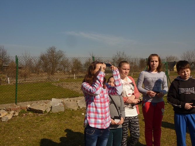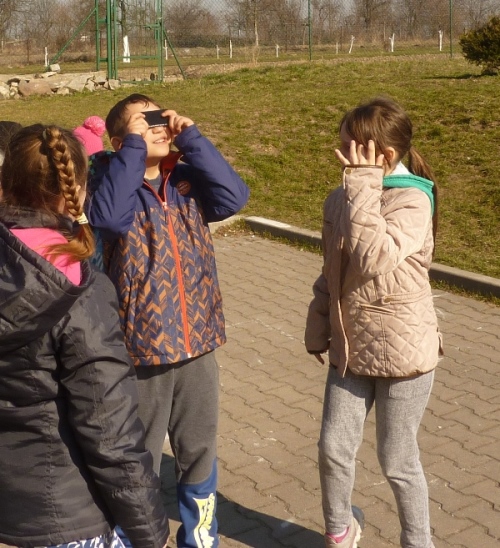Uczniowie naszej szkoły także mieli możliwość obserwowania zaćmienia. Wyposażeni w odpowiedni „sprzęt” do bezpiecznej obserwacji, z zadartymi głowami wykrzykiwali co chwilę: „super!”, „ale fajne!”, „ale rogal!”, „jest coraz mniejsze!”. A i grono pedagogiczne chętnie zerkało w niebo…