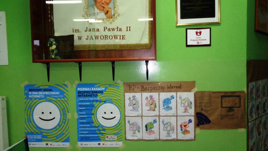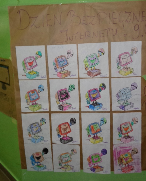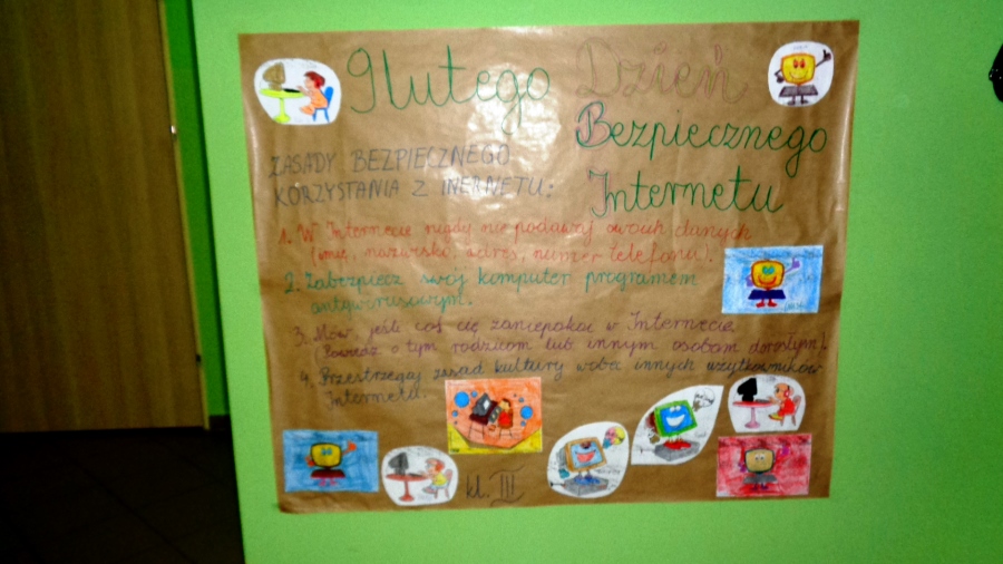 Także nasza szkoła aktywnie włączyła się w obchody Dnia Bezpiecznego Internetu. Z racji tego, że 9 lutego przypadał w okresie ferii zimowych, nasi uczniowie zgłębili temat już przed feriami. Uczniowie klas I-VI, a także Punktu Przedszkolnego i Oddziału Przedszkolnego, powtórzyli zasady bezpiecznego korzystania z internetu, obejrzeli wiele filmów edukacyjnych nawiązujących do tematyki bezpieczeństwa w sieci - kreskówki "Owce w sieci", "Zuzia i Tunio", filmy z serii "Lekcje bezpieczeństwa" - oraz wykonali plakaty promujące bezpieczne korzystanie z sieci internetowej. Najciekawsze prace zostały wywieszone w holu szkoły.