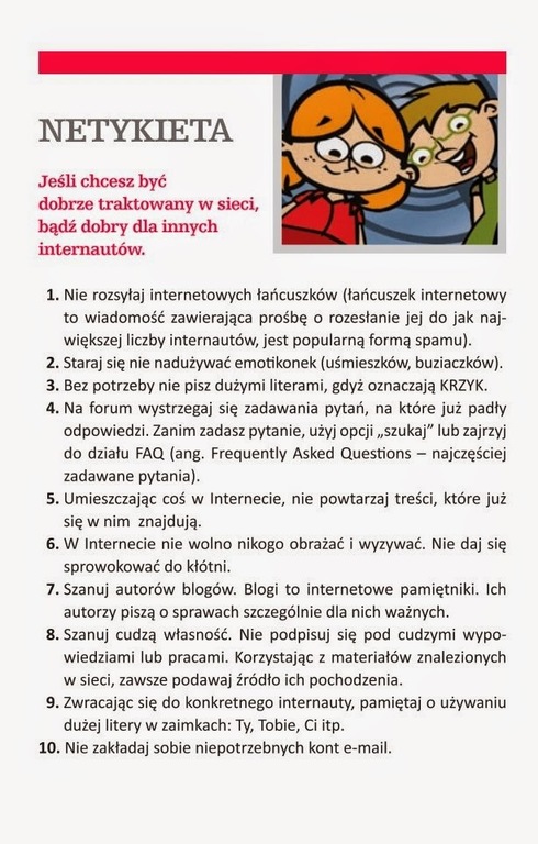 W ramach obchodów DBI w naszej szkole odbył się także konkurs na rymowankę lub wiersz propagujący bezpieczne zachowania w internecie, pod hasłem „Lepszy internet zależy od Ciebie”. Najciekawsze okazały się prace dwóch uczennic klasy IV – Jagody Puzyniak i Amelii Juźków, prezentowane poniżej.