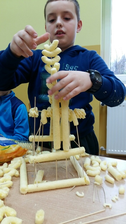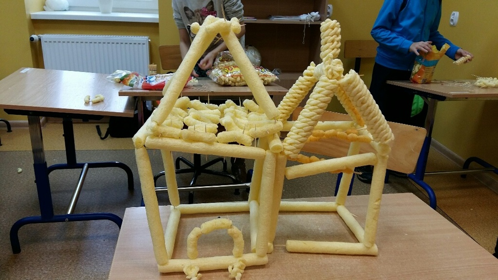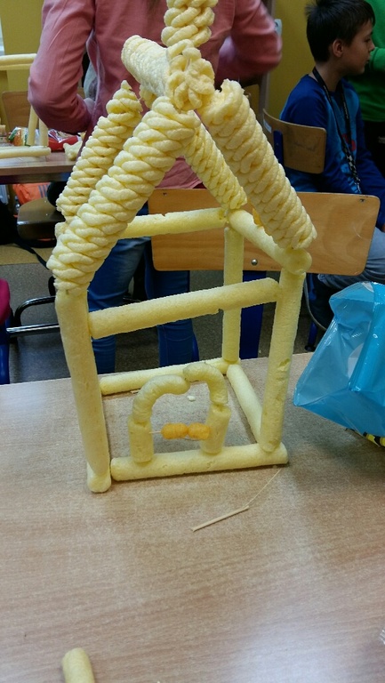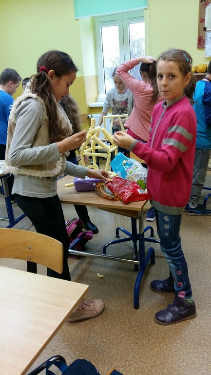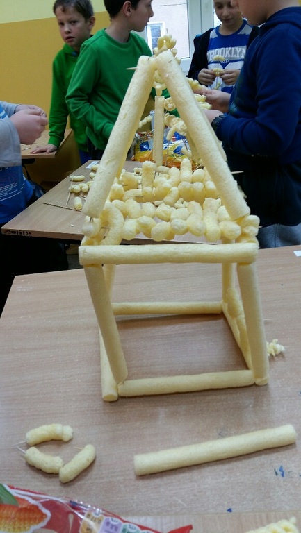 „Proszę Panią my chcemy coś pobudować”- usłyszałam od moich uczniów z klasy IV i tak zrodził się nam wspólny pomysł na lekcję, której wielkimi inicjatorami i pomysłodawcami byli moi uczniowie. Budowali, konstruowali, przerabiali …. a na koniec wszystko zjedli!!! Tak w wielkim skrócie przebiegła jedna z lekcji plastyki w klasie IV na której to moi uczniowie wykonywali budowle z chrupek kukurydzianych. Efekty ich budowniczego zapału możecie podziwiać niestety tylko na zdjęciach ponieważ, jak już wyżej wspominałam, wszystko zostało pochłonięte przez konstruktorów.