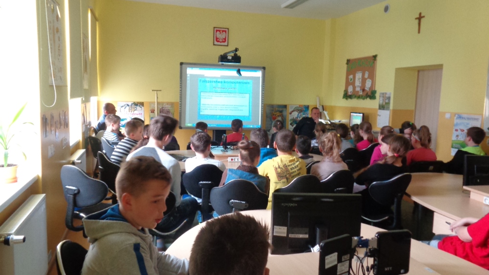 12 kwietnia w naszej szkole gościli przedstawiciele z Komisariatu Policji w Wiązowie, którzy podjęli z uczniami klas IV- VI temat szeroko rozumianej cyberprzemocy. W prezentacji pojawiły się takie pojęcia, jak przestępstwo (fałszerstwo) komputerowe, piractwo komputerowe, łamanie praw autorskich, publikacja zdjęć w sieci internetowej, w szczególności na portalach społecznościowych itp.