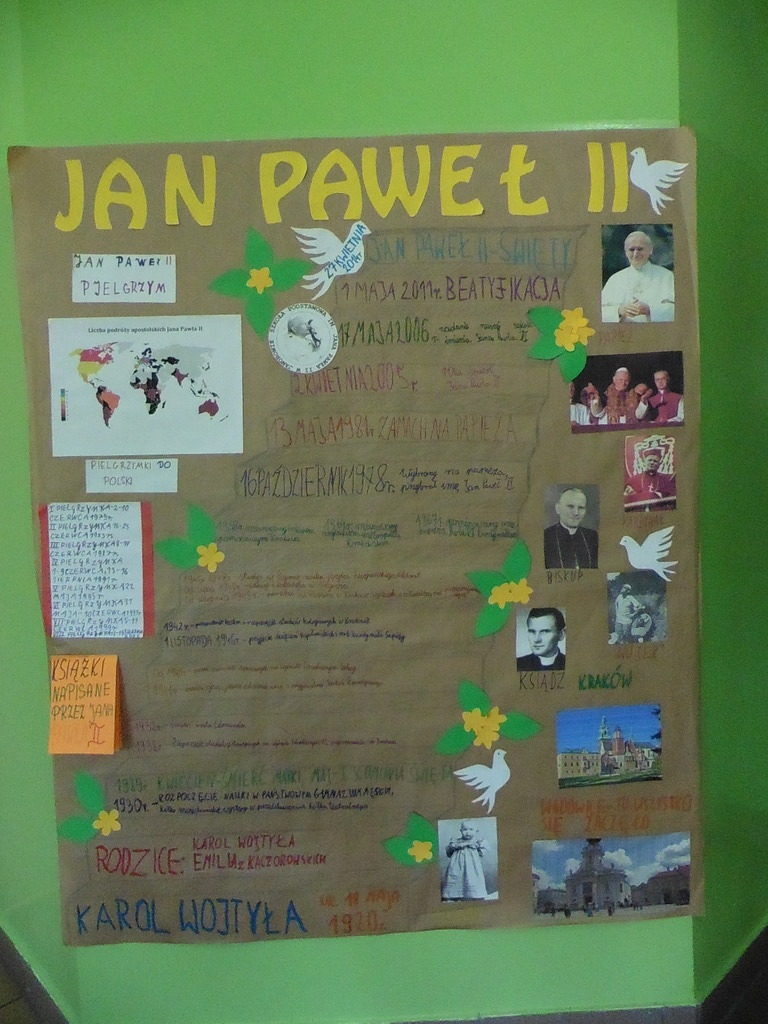 Z okazji zbliżającej się rocznicy urodzin patrona naszej szkoły - Jana Pawła II - Samorząd Uczniowski ogłosił konkurs dla klas na najładniejszy i najciekawszy plakat dotyczący osoby papieża - Polaka. Wszystkie klasy przygotowały piękne plakaty a 18 maja jury wybrało najciekawsze. W kategorii klas młodszych wygrała klasa III, zaś w kategorii klas starszych - klasa IV. Dla zwycięzców przewidziano nagrody ufundowane przez Panią Dyrektor.