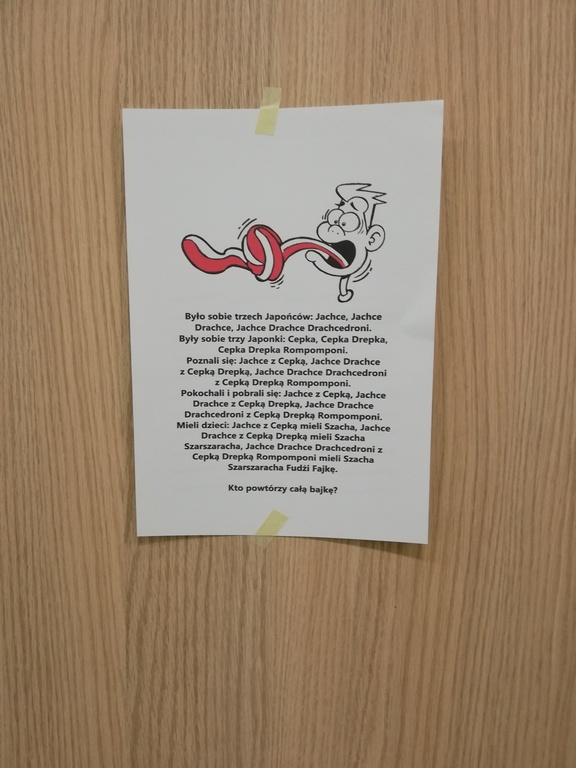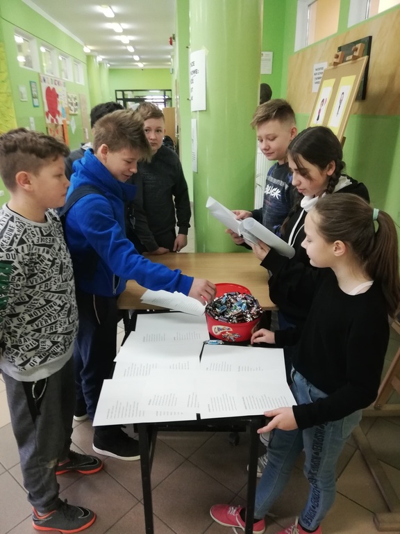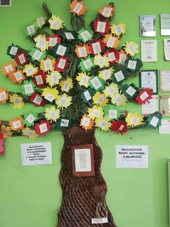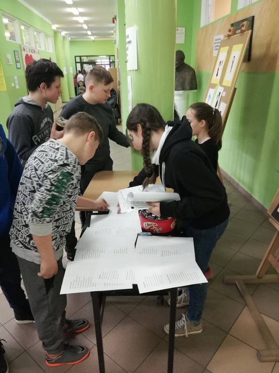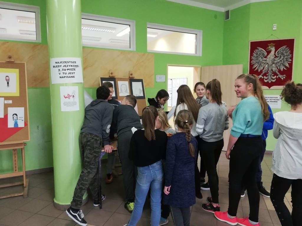 Już od rana na uczniów czekały inspirujące niespodzianki. Korytarz szkolny został oblepiony plakatami z najczęściej popełnianymi błędami językowymi. Zaznaczono na nich normę wzorcową danego wyrazu lub wyrażenia, aby młodzież unikała tych pomyłek w swoich wypowiedziach. Na pierwszych lekcjach nauczyciele wraz z uczniami uczestniczyli w krótkiej zabawie, podejmując wyzwanie bezbłędnego wypowiedzenia łamańców językowych... Śmiechu było co niemiara! Na przerwach każdy miał możliwość sprawdzenia swojej wiedzy o języku ojczystym. Za poprawną odpowiedź, otrzymywano cukierka. Chętnych do sprawdzenia wiedzy było wielu... Uwieńczeniem dnia było Wielkie Szkolne Dyktando, do którego przystąpili ochotnicy, ubiegający się o tytuł szkolnego Mistrza Ortografii.