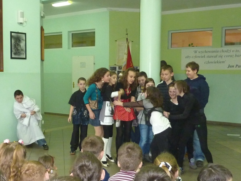 Za pomocą ruchu, gestów, mimiki i dźwięku uczniowie przedstawili stworzenie człowieka i niebezpieczeństwa współczesnego świata, które przesłaniają mu jedyną prawdę w życiu, o której mówił błogosławiony Jan Paweł II, że jest najważniejsza. To miłość Boga, która pokonuje wszelkie przeszkody i zmartwychwstaje każdego dnia.