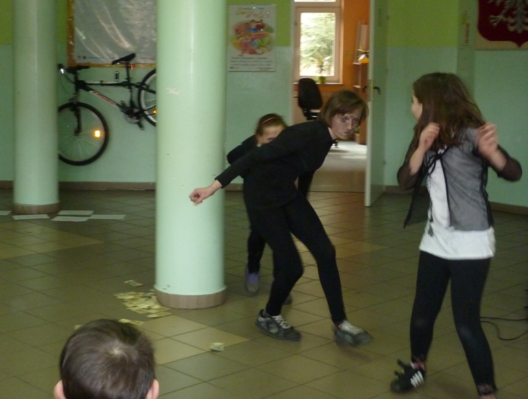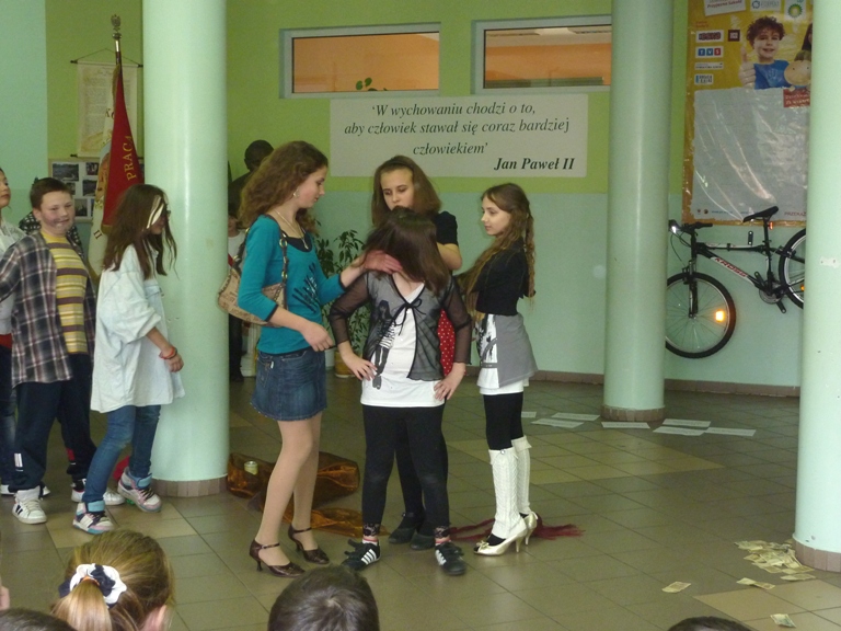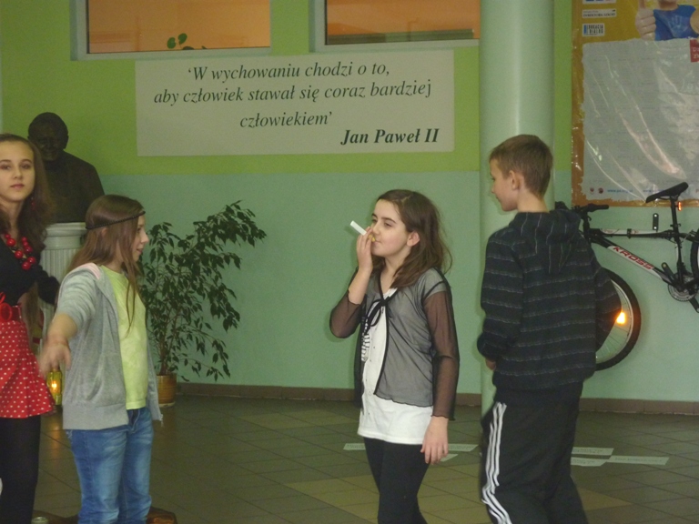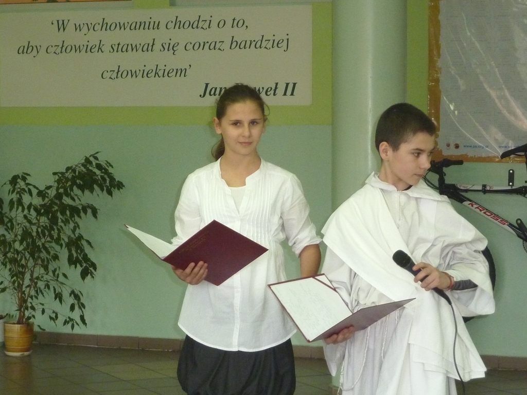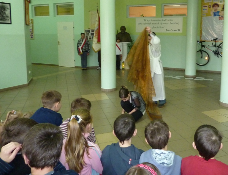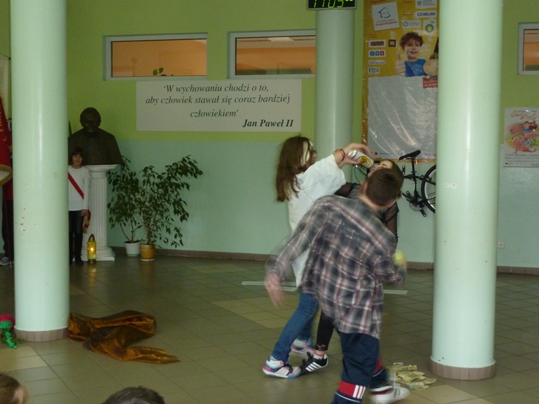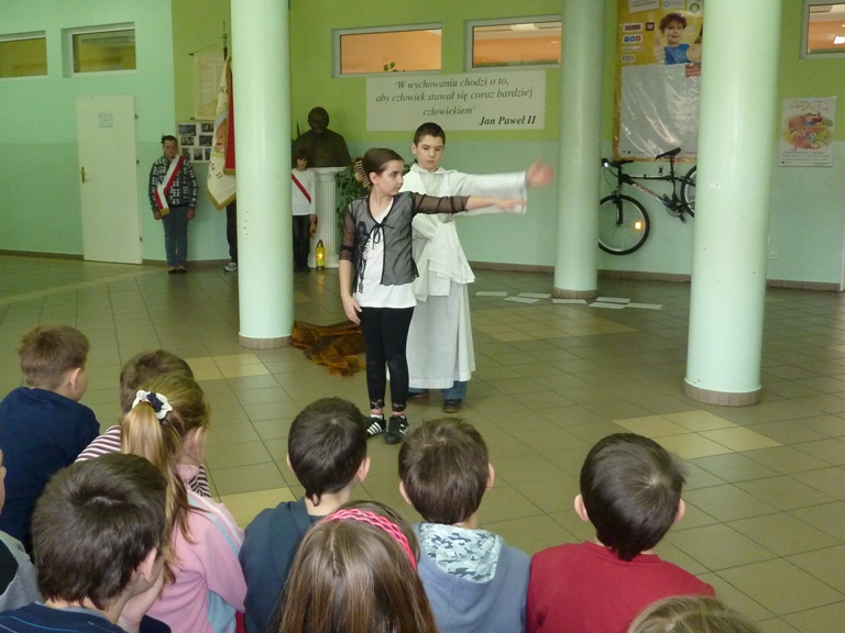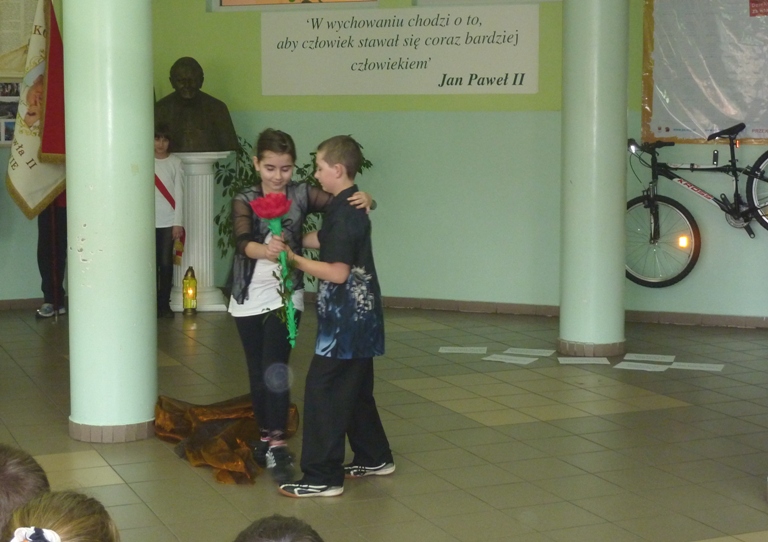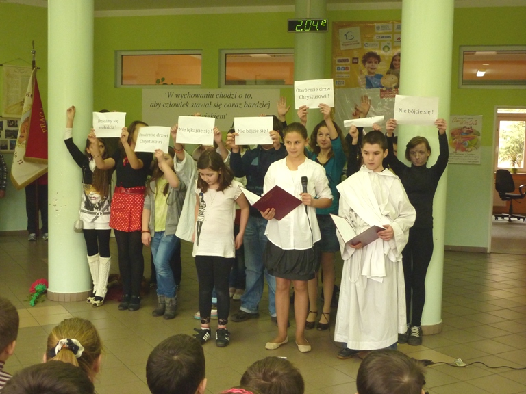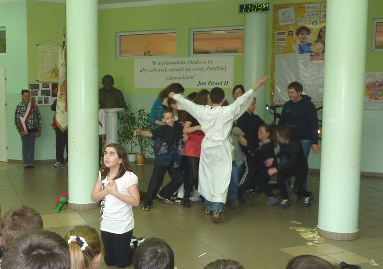 Na uczniów i nauczycieli zgromadzonych przy popiersiu papieża czekały niezwykłe wydarzenia. Członkowie koła teatralnego, przy pomocy p. Oli Stadnik, przedstawili wzruszającą pantomimę pt. „Jezus żyje i walczy o każdego z nas”.