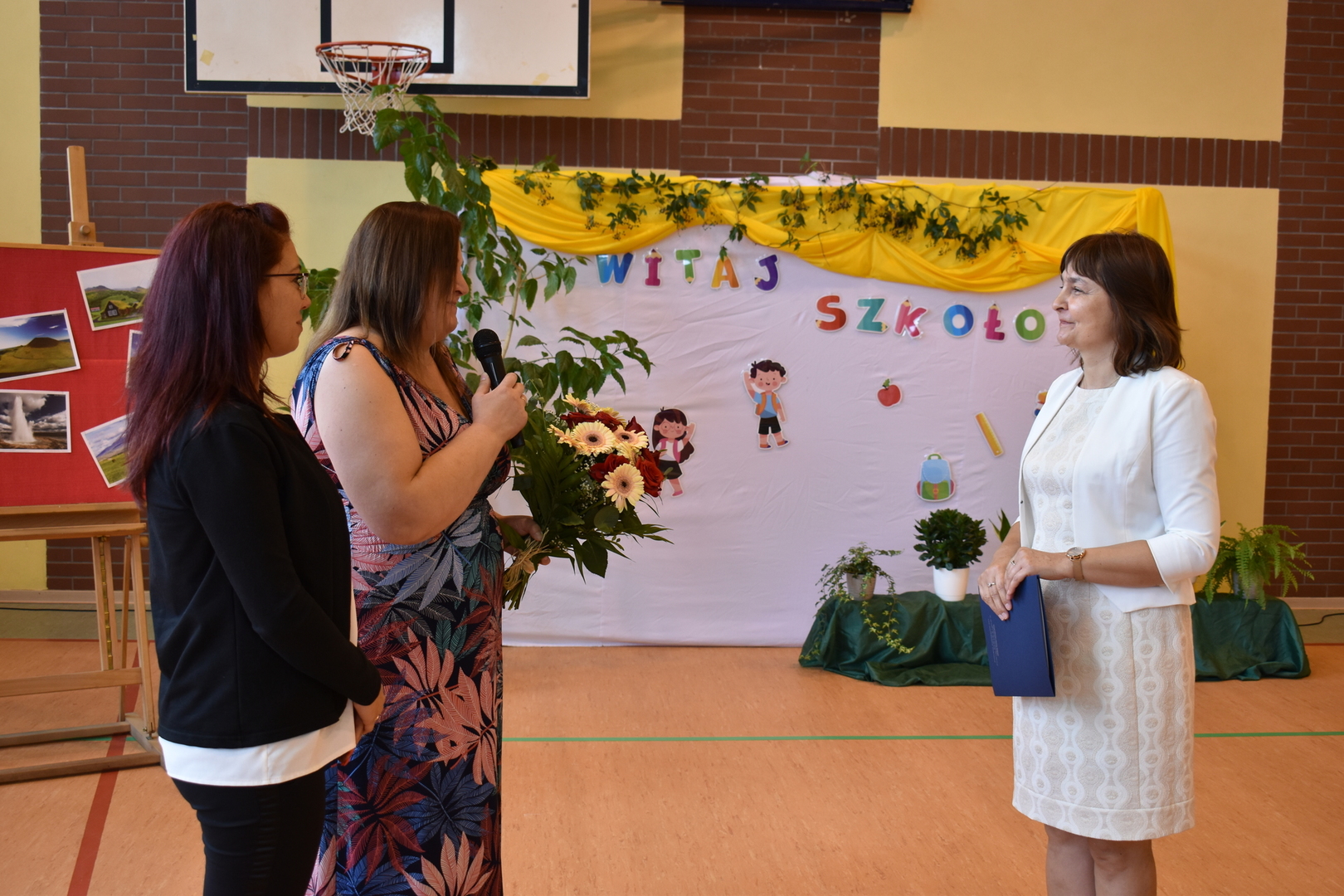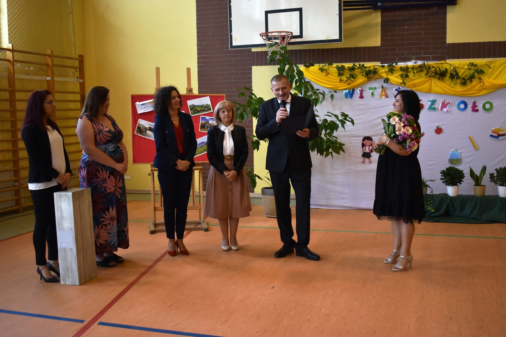 Następnie Pan Burmistrz odczytał akt powołania nowej Pani Dyrektor Beaty Prorok - nauczycielki z wieloletnim stażem pracy w szkole, ostatnio pełniącej funkcję wicedyrektora Szkoły Podstawowej im. Piastów Śląskich w Wiązowie - życząc wielu sukcesów i powodzenia w nowej pracy. Do życzeń dołączyły przedstawicielki Rady Rodziców, które wyraziły nadzieję na owocną i miłą współpracę.