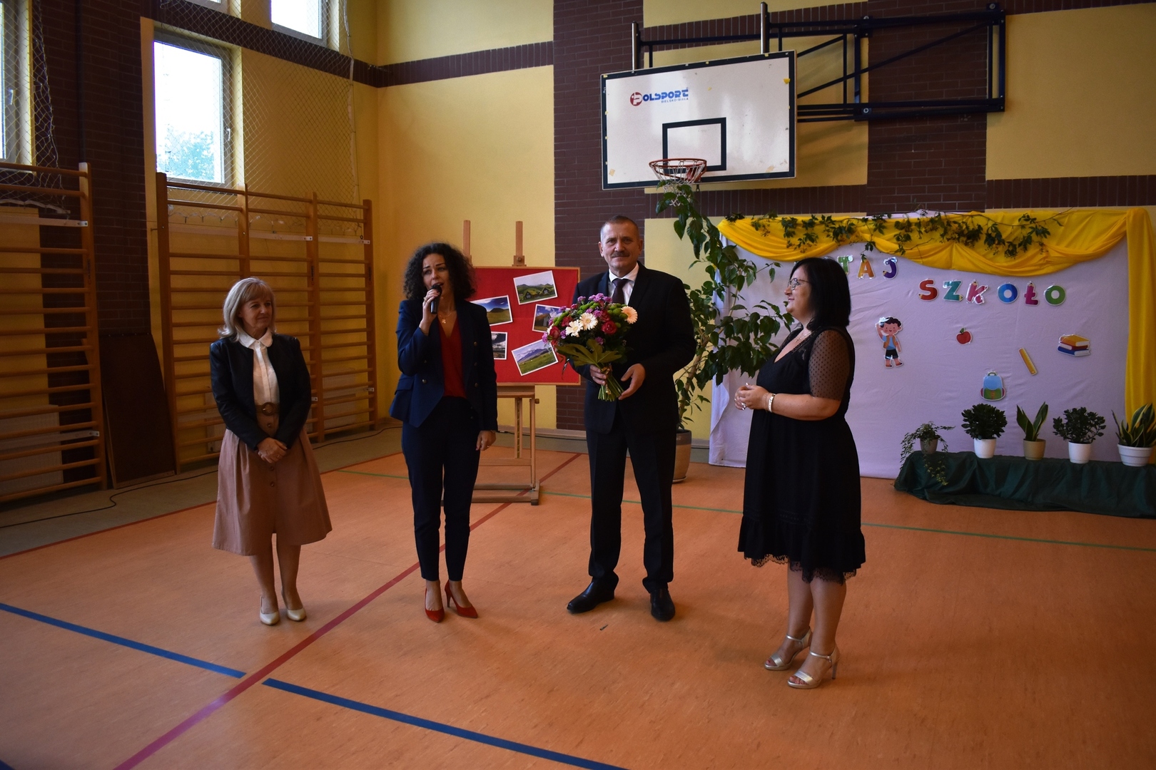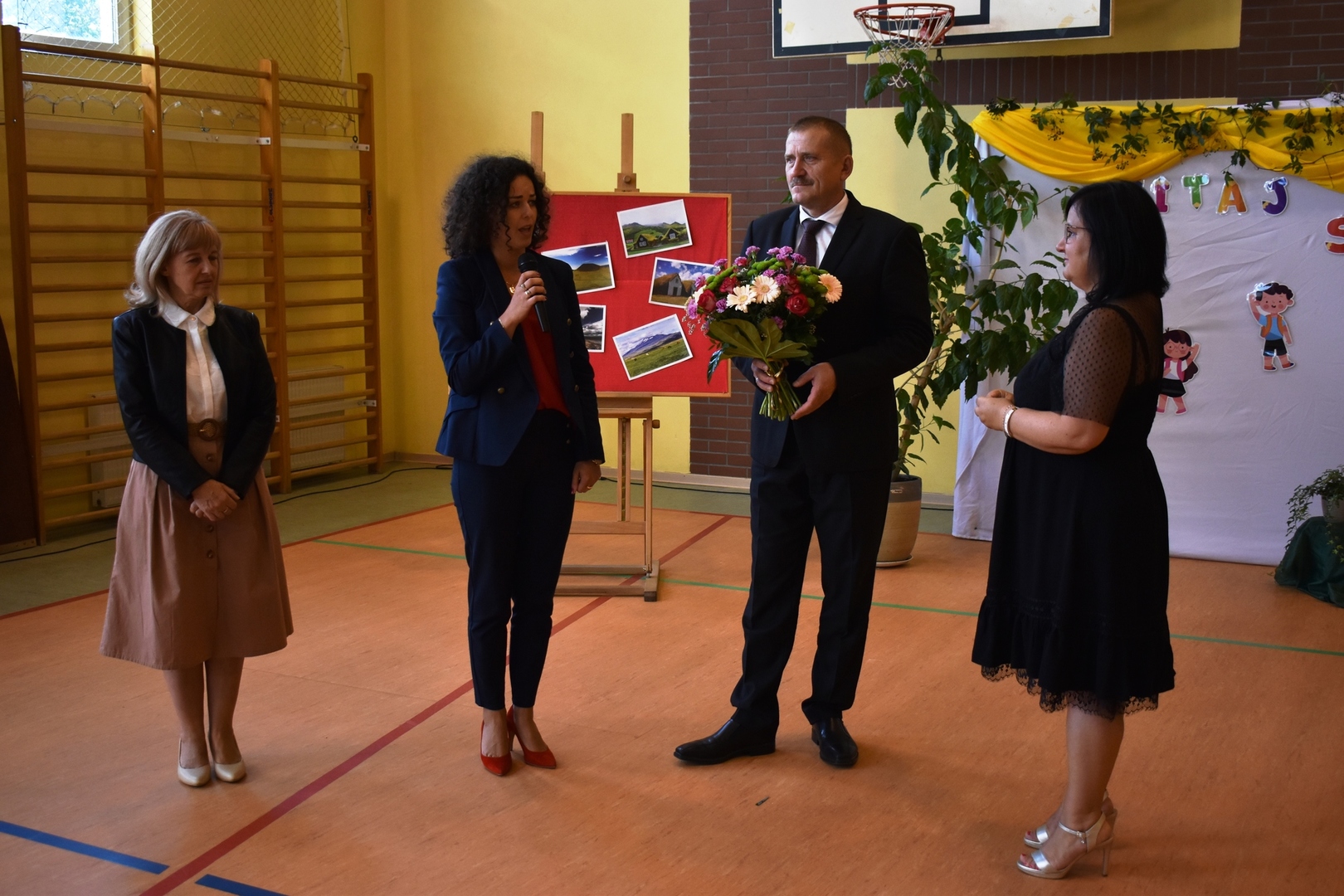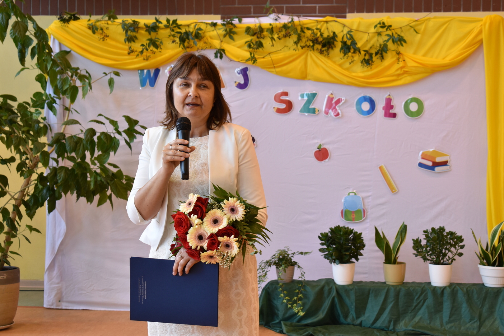 Uroczystego pożegnania ustępującej pani dyrektor dokonał Burmistrz Miasta i Gminy Wiązów Jerzy Krochmalny wraz z Panią Sekretarz Agnieszką Puzyniak oraz Panią Skarbnik Wiesławą Kaczmarczyk. Pan Burmistrz podziękował Pani Stadnik za 8 lat kierowania szkołą i ogromny wkład pracy w jej wspaniały rozwój i unowocześnienie oraz wręczył nagrodę jubileuszową za 30 lat pracy w szkole. Następnie życzył wielu sukcesów w nowym miejscu pracy tj. w Szkole Podstawowej im. Piastów Śląskich w Wiązowie, gdzie Pani Ola objęła stanowisko dyrektora szkoły. Do życzeń i podziękowań dołączyły także przedstawicielki Rady Rodziców, które podziękowały za wieloletnią pracę na rzecz szkoły i serdeczną współpracę.