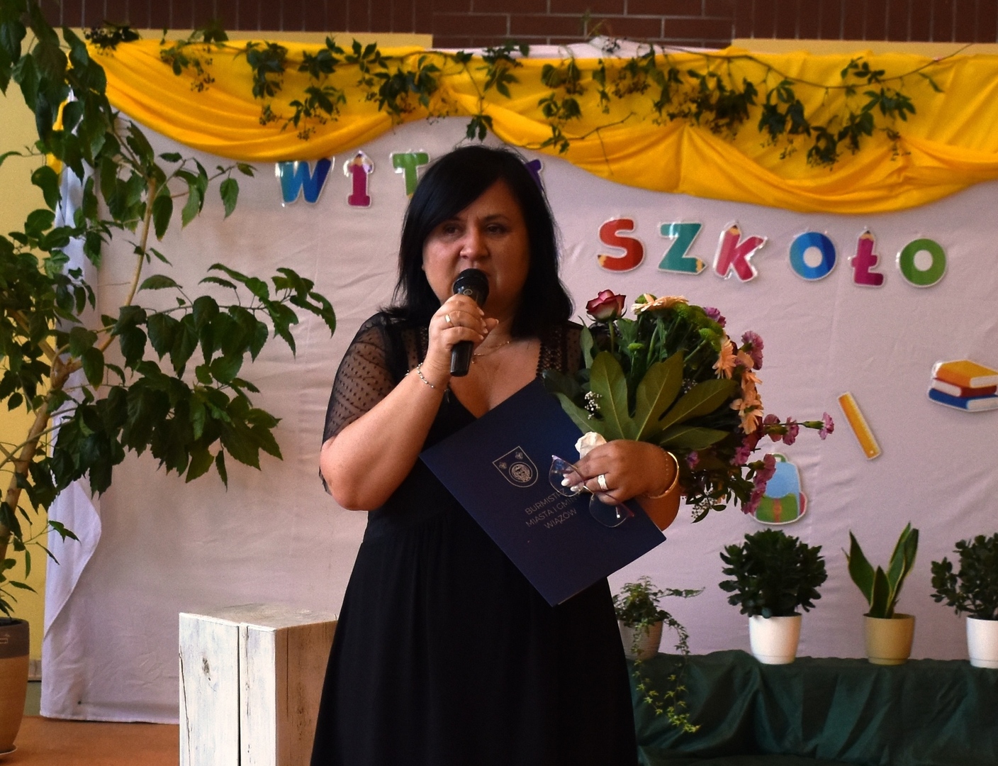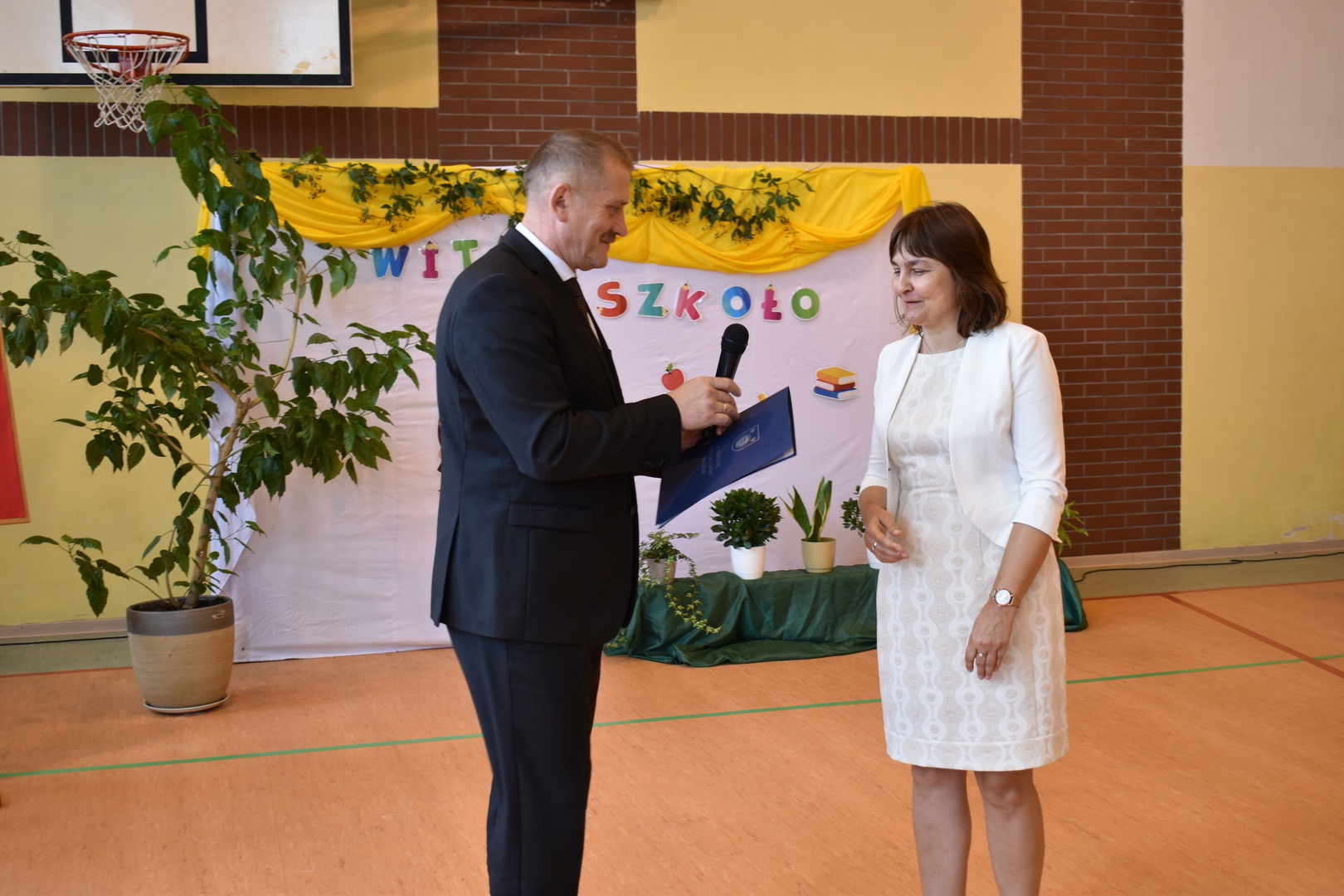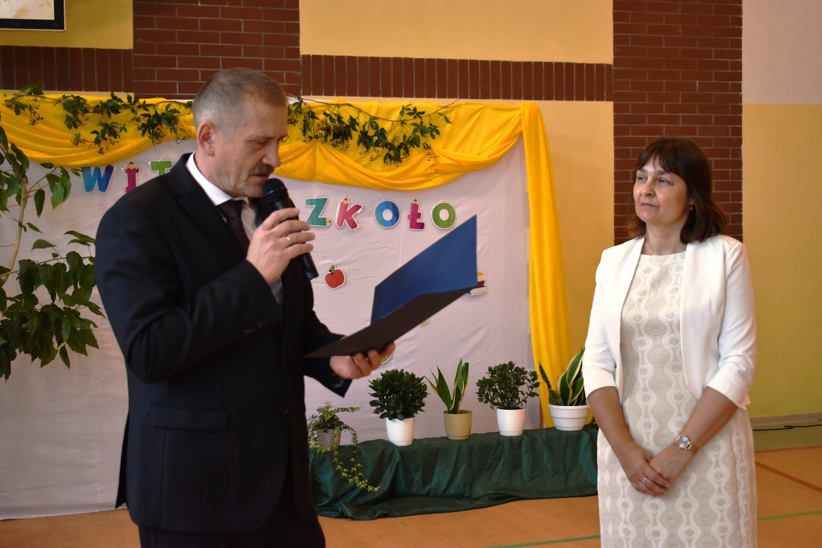 Uroczystego pożegnania ustępującej pani dyrektor dokonał Burmistrz Miasta i Gminy Wiązów Jerzy Krochmalny wraz z Panią Sekretarz Agnieszką Puzyniak oraz Panią Skarbnik Wiesławą Kaczmarczyk. Pan Burmistrz podziękował Pani Stadnik za 8 lat kierowania szkołą i ogromny wkład pracy w jej wspaniały rozwój i unowocześnienie oraz wręczył nagrodę jubileuszową za 30 lat pracy w szkole. Następnie życzył wielu sukcesów w nowym miejscu pracy tj. w Szkole Podstawowej im. Piastów Śląskich w Wiązowie, gdzie Pani Ola objęła stanowisko dyrektora szkoły. Do życzeń i podziękowań dołączyły także przedstawicielki Rady Rodziców, które podziękowały za wieloletnią pracę na rzecz szkoły i serdeczną współpracę.