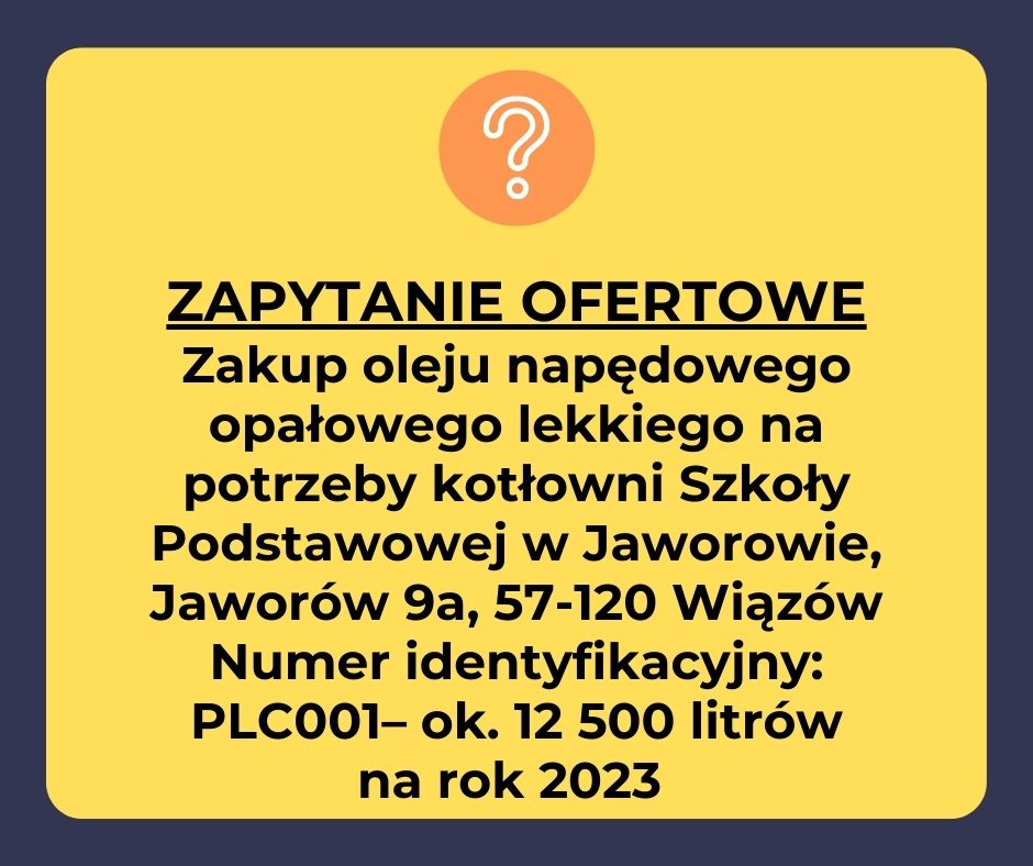 Zakup oleju napędowego opałowego lekkiego na potrzeby kotłowni Szkoły Podstawowej w Jaworowie, Jaworów 9a, 57-120 Wiązów Numer identyfikacyjny: PLC001– ok. 12 500 litrów na rok 2023