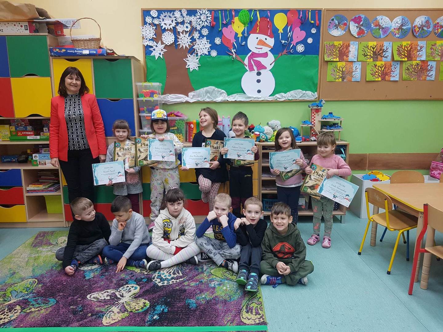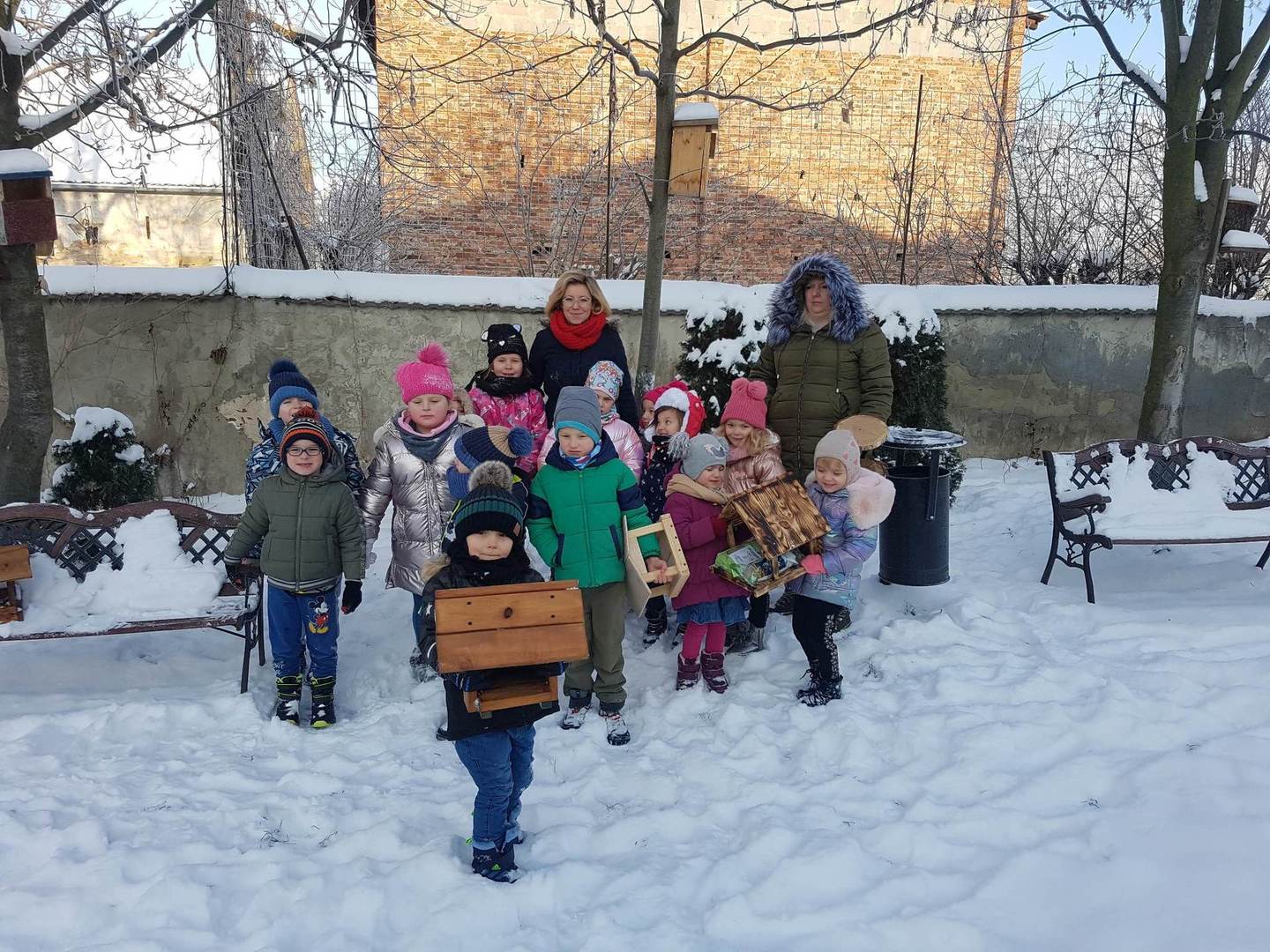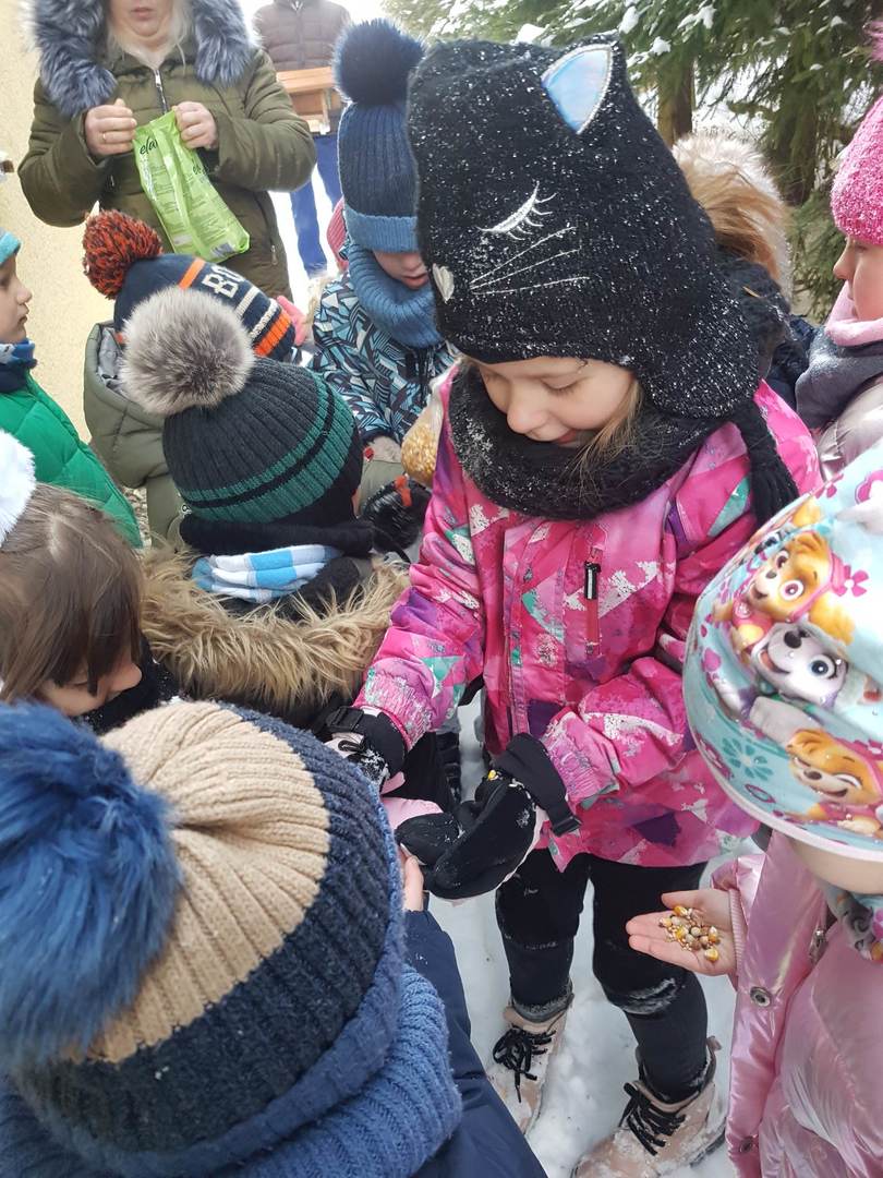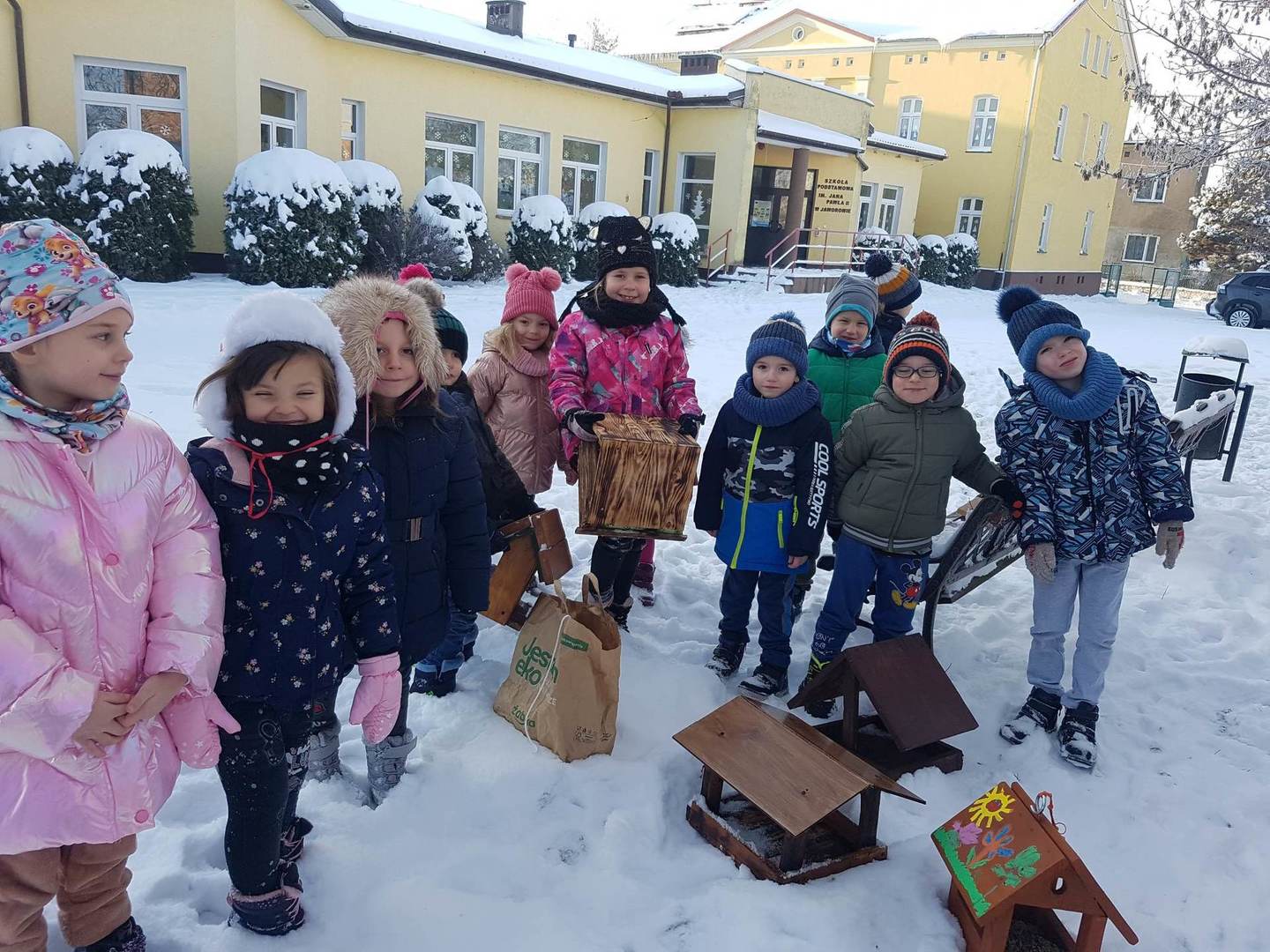 Dzieci z Punktu Przedszkolnego i Oddziału Przedszkolnego wzięły udział w akcji "Dokarmiamy ptaki w zimie". Wykonały karmniki wraz z rodzicami i przyniosły ptasie przysmaki, za co zostały nagrodzone