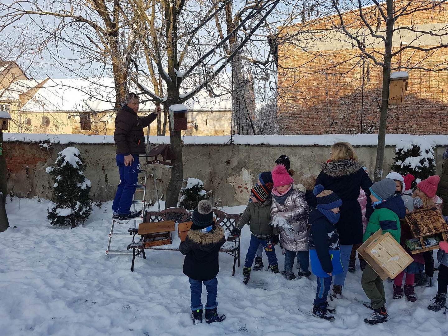 Zima, zima, lecz bez liku jest przy szkole już karmników...