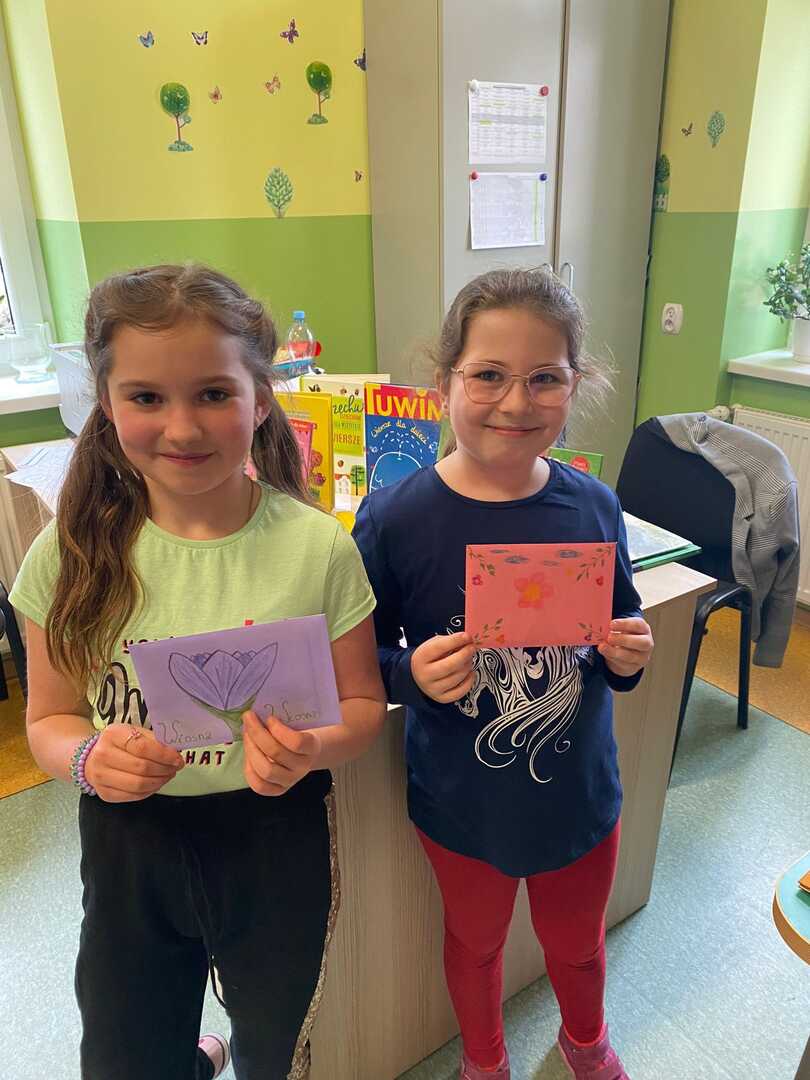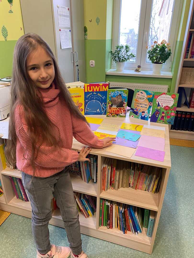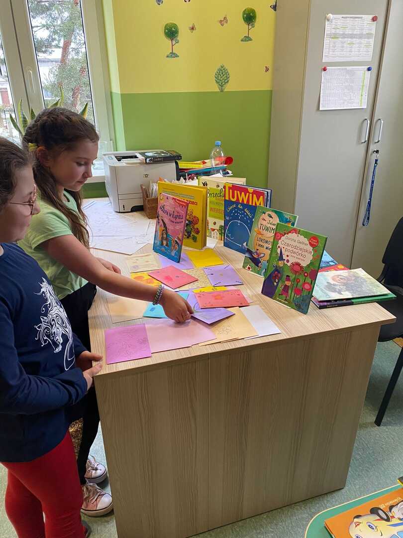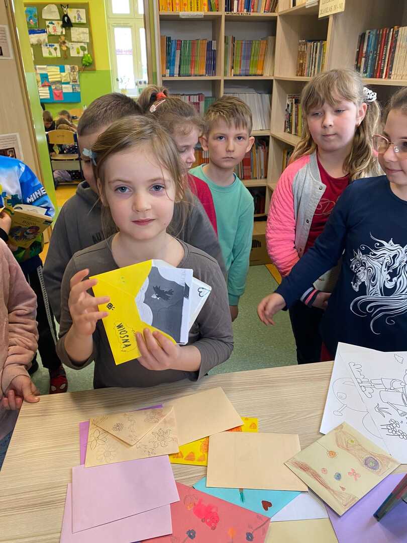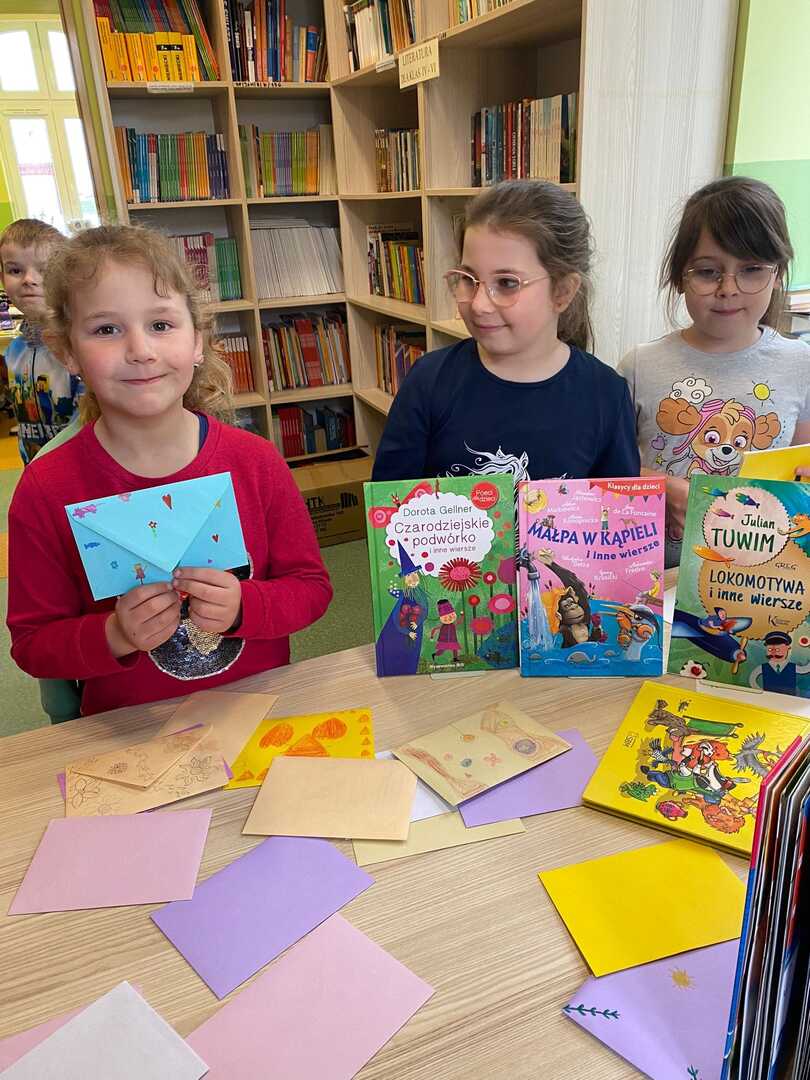 Z okazji Światowego Dnia Poezji uczniowie klas 1-3 mogli w bibliotece szkolnej „poczęstować się” poezją, zabrać kopertę z wierszem do domu i zastanowić się nad tym, co poeta miał na myśli. Chętni uczniowie wykonają do wybranych wierszy ilustracje, które wezmą udział w szkolnym konkursie plastycznym „Obrazy wierszem malowane”.