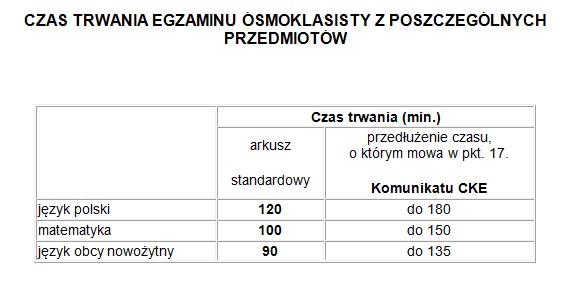 - CZAS TRWANIA EGZAMINU Z POSZCZEGÓLNYCH PRZEDMIOTÓW MOŻE BYĆ WYDŁUŻONY W PRZYPADKU UCZNIÓW, KTÓRYM PRZYSŁUGUJE DOSTOSOWANIE WARUNKÓW PRZEPROWADZANIA EGZAMINU.
