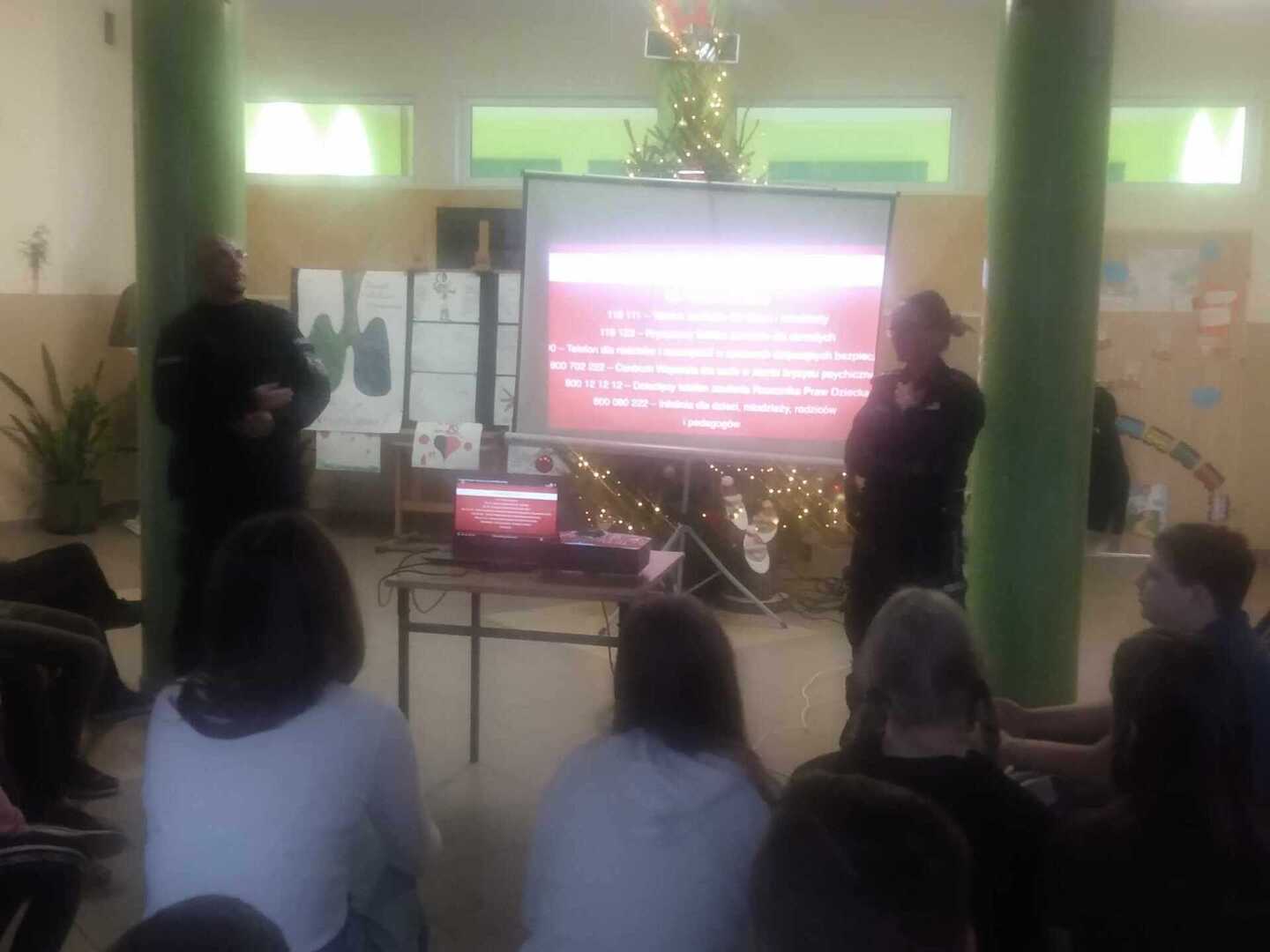 Aspirant sztabowy Jacek Waś oraz aspirant Joanna Demska rozmawiali z uczniami na temat cyberprzemocy i bullyingu (przemoc rówieśnicza). Opowiedzieli czym one są i jakie są ich rodzaje. Przypomnieli o sposobach radzenia sobie w takich sytuacjach i gdzie szukać pomocy. Policjanci przedstawili także konsekwencje dla tych, którzy stosują przemoc rówieśniczą, czy cyberprzemoc wobec swoich kolegów i koleżanek. W spotkaniu z uczniami wzięła również udział pani Regina z PSSE w Strzelinie, która omówiła zagadnienia związane z szeroko pojętą profilaktyką: (e-papierosy, alkohol, narkotyki, Covid-19). Na zakończenie spotkania młodzież otrzymała piłeczki antystresowe z logo promującym życie wolne bez narkotyków ufundowane przez Urząd Miasta i gminy Wiązów.