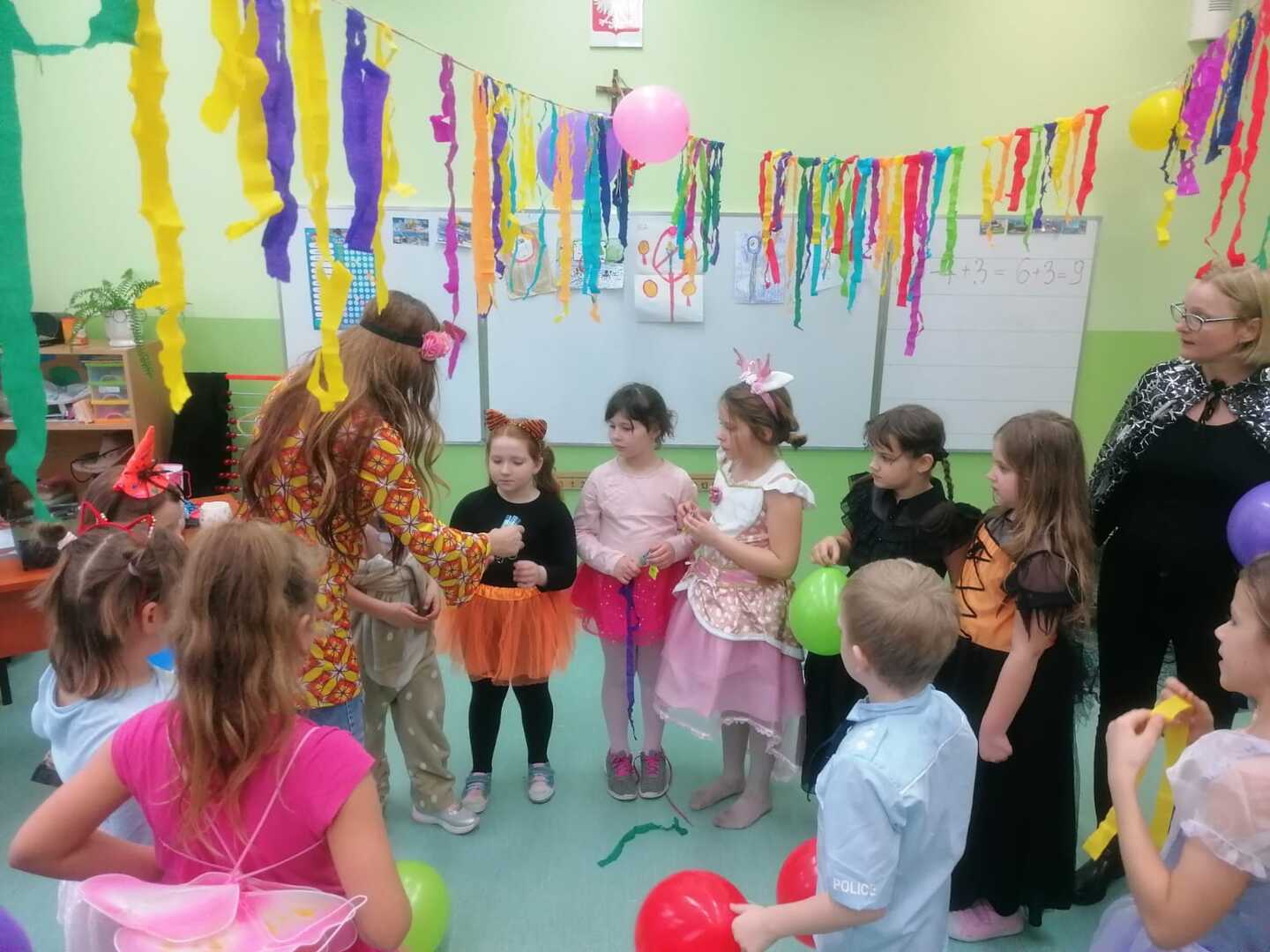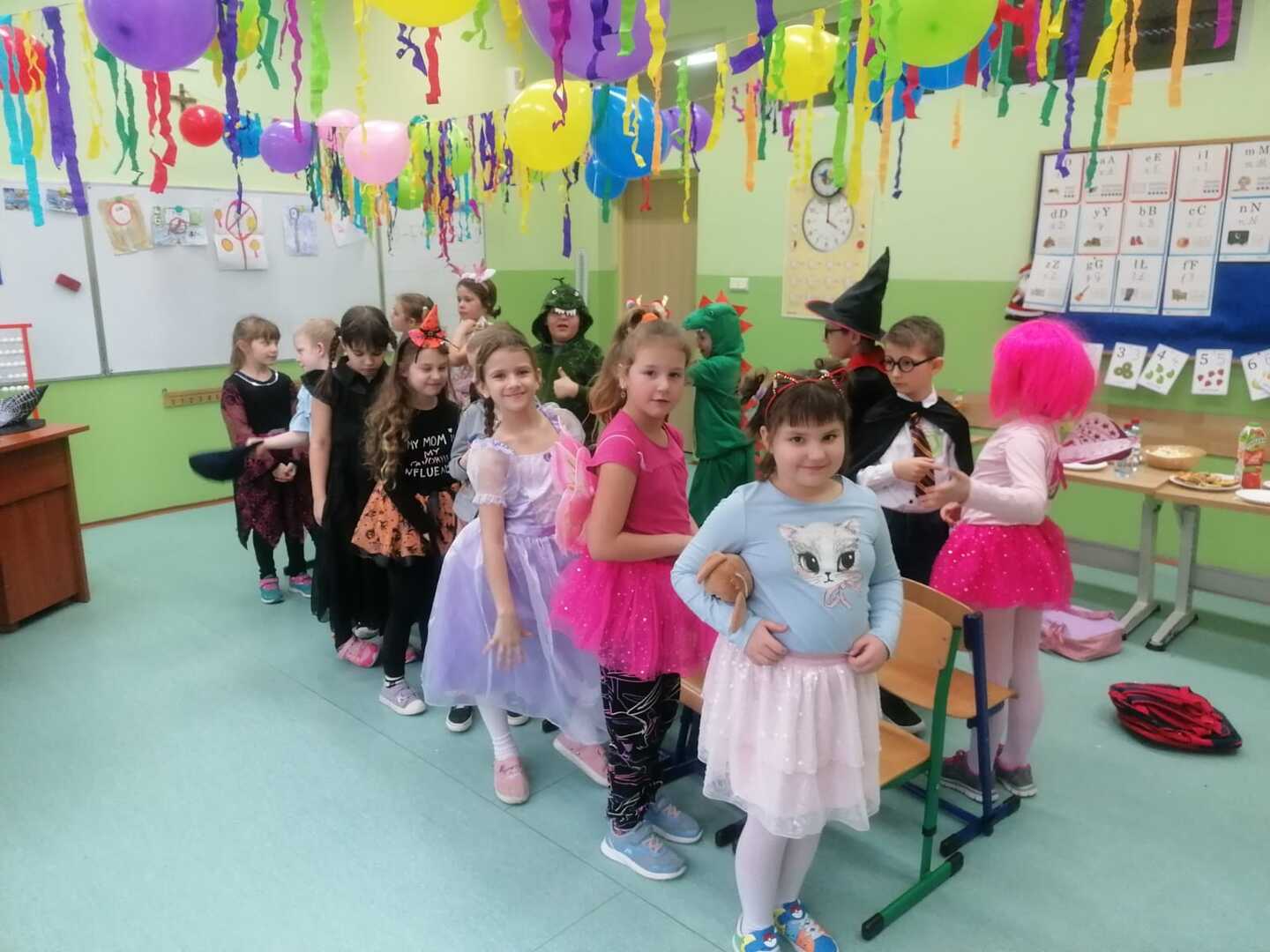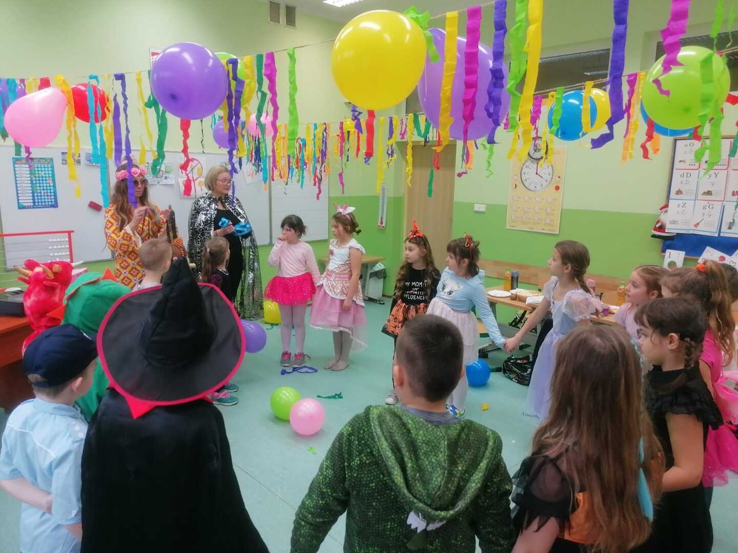 6 lutego w naszej szkole odbył się długo wyczekiwany przez dzieci bal karnawałowy. Uczniowie klasy 1 i 2 wraz z Paniami wspólnie uczestniczyli w tańcach i zabawach w pięknie udekorowanej bibułami i balonami sali. Wśród dzieci można było zauważyć przebrania za różne zwierzęta i postaci z ulubionych bajek. Niektórych ciężko było rozpoznać Radości i zabawie nie było końca. Za słodki poczęstunek serdecznie dziękujemy jak zawsze niezawodnym Rodzicom. Kolejny bal już za rok!