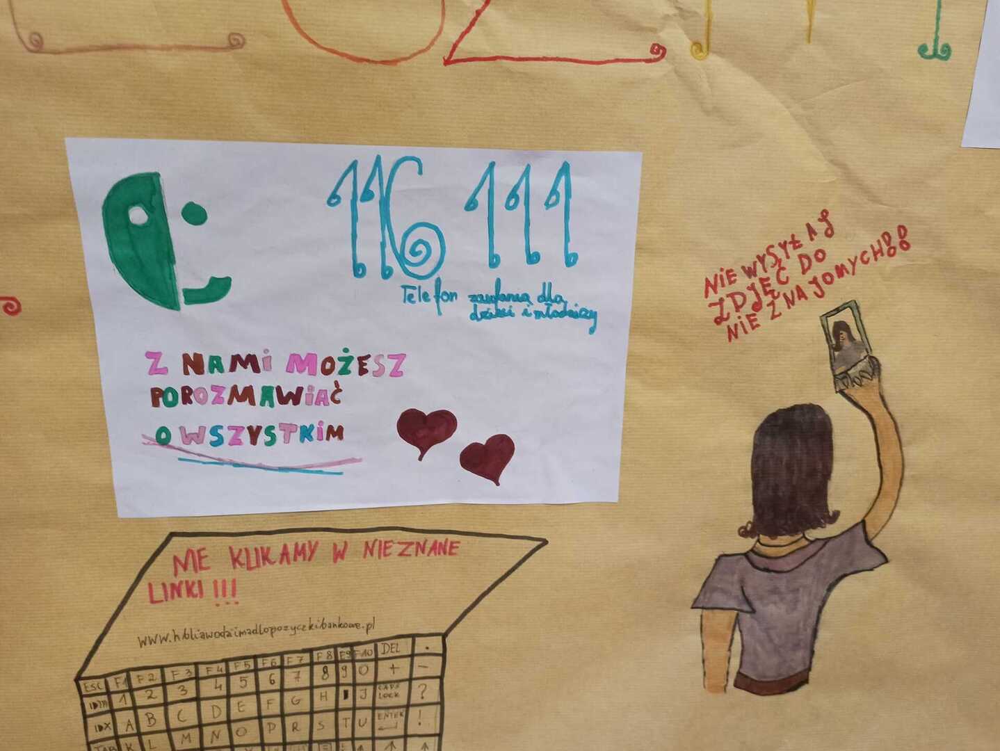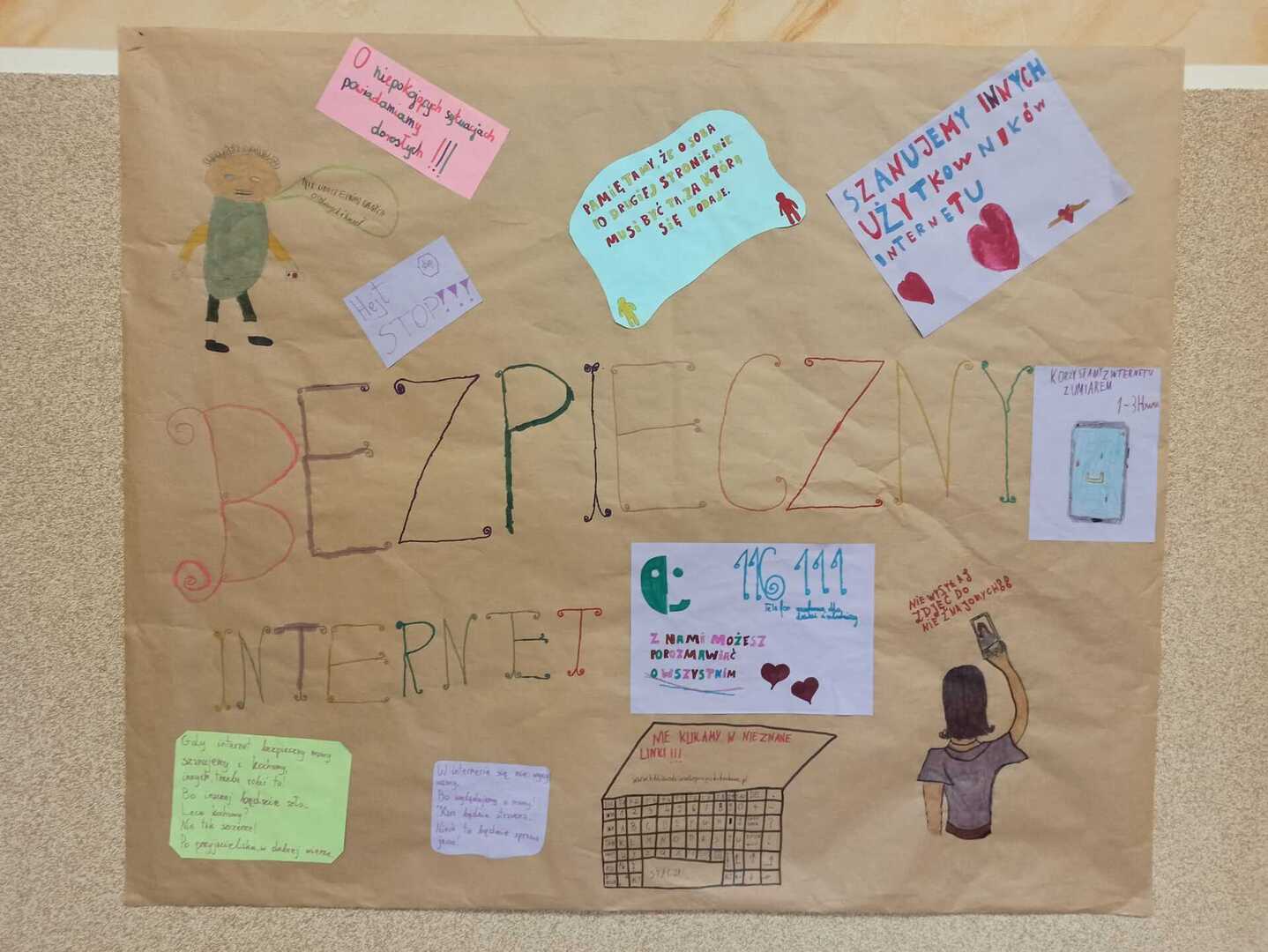 Z tej okazji młodsi uczniowie uczestniczyli w prelekcji przeprowadzonej przez pedagoga szkolnego. Z kolei starsi uczniowie poznawali i przypominali sobie podstawowe zasady bezpiecznego korzystania z sieci podczas lekcji informatyki - poprzez dyskusję oraz filmy edukacyjne przygotowane w ramach programów "Safer Internet" i "Cyfrowobezpieczni". Podsumowaniem tych działań było wykonanie plakatów udostępnionych całej społeczności szkolnej w holu szkoły.