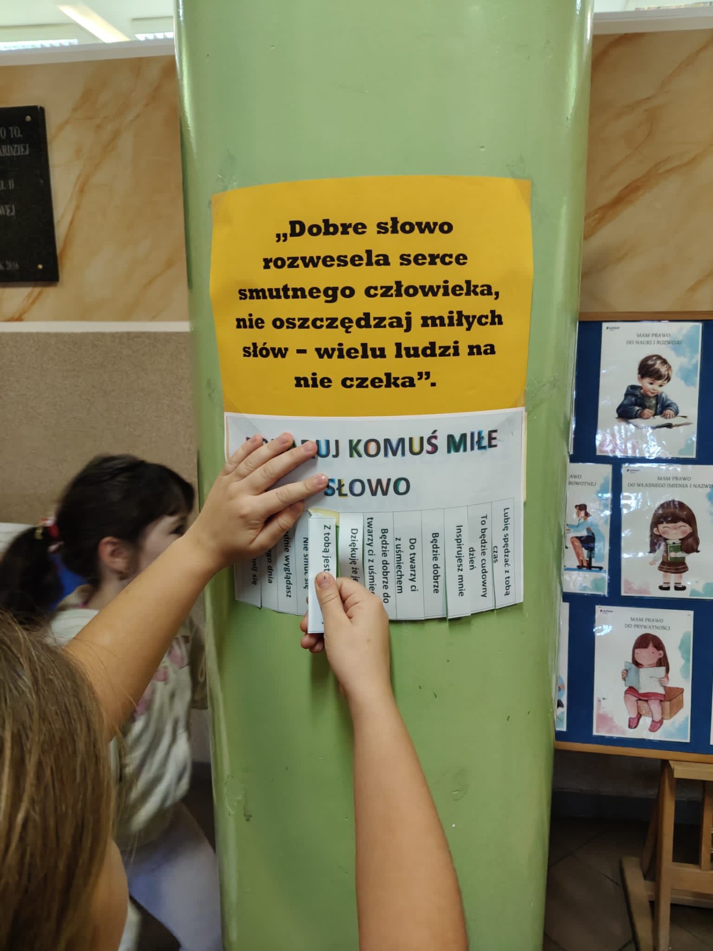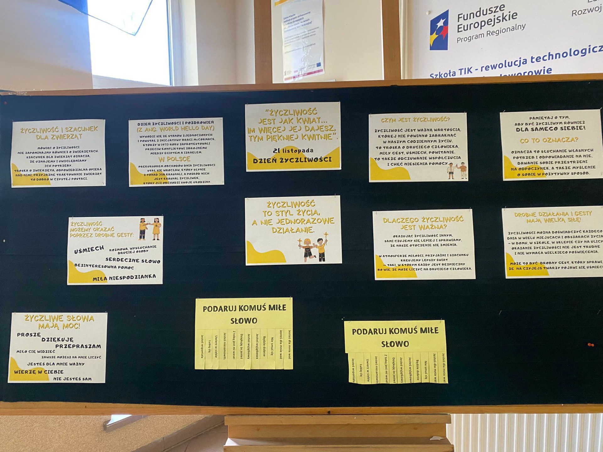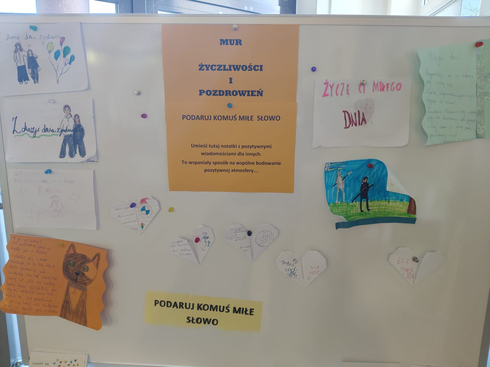 Pojawił się także „Mur Życzliwości i Pozdrowień”, na którym uczniowie mogli przypinać karki z pozdrowieniami dla innych. Dzięki zaangażowaniu uczniów i nauczycieli "Dzień Życzliwości" upłynął w atmosferze uśmiechu i dobrej zabawy. Wszystkim razem i każdemu z osobna dziękujemy za zaangażowanie, pomoc i uczestnictwo w tym dniu. Pamiętajmy, aby życzliwość w naszym życiu była obecna codziennie, a nie tylko od święta.
