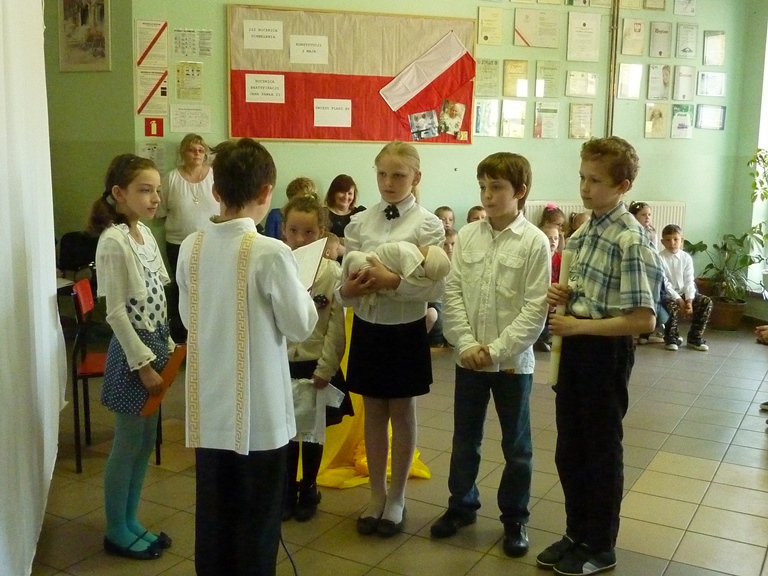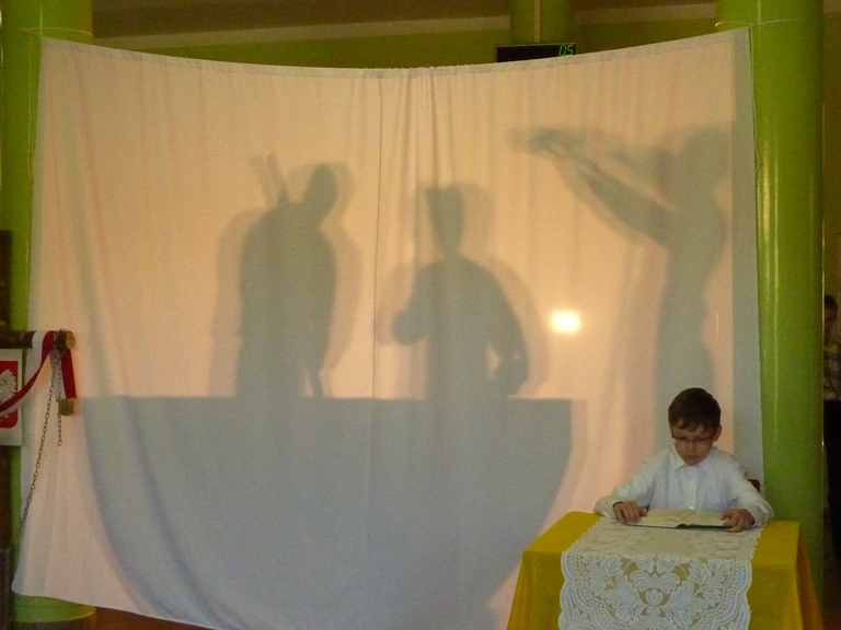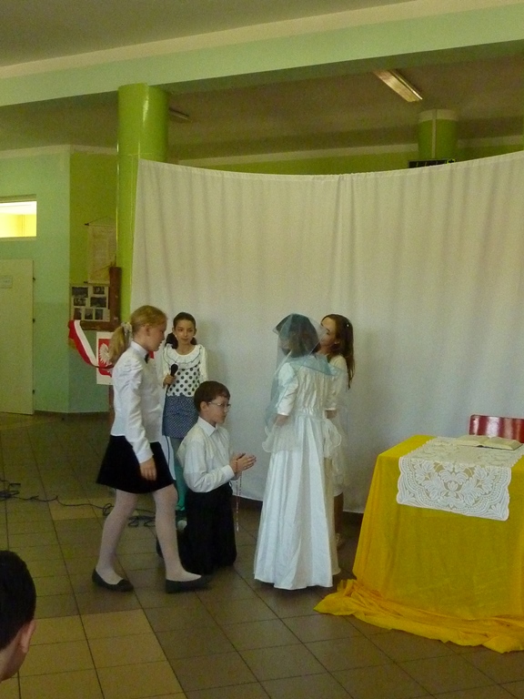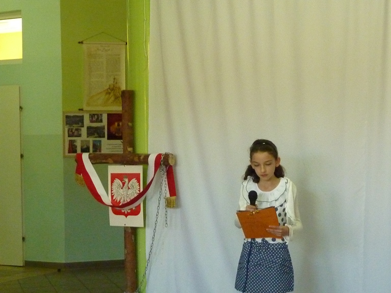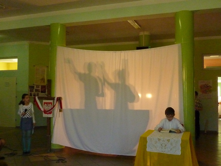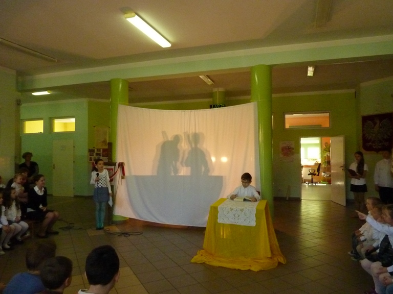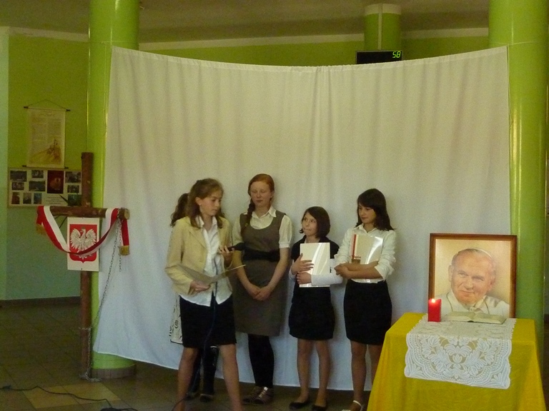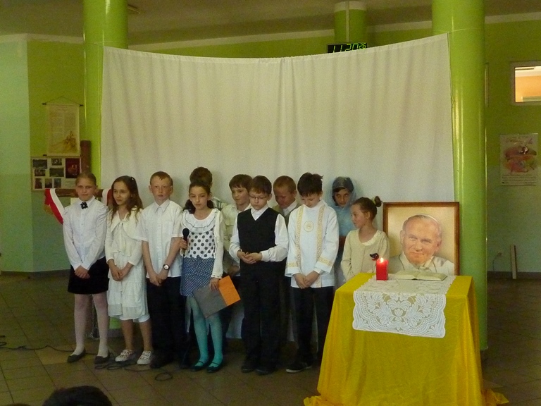Postanowiliśmy, że jako szkoła mająca za patrona Jana Pawła II w szczególny sposób uczcimy rocznicę Jego beatyfikacji poprzez przypomnienie fragmentów życia Papieża w przedstawieniu "Lolek w ciszy Niepokalanej". Uczniowie klasy 4 przygotowali sztukę wykorzystującą elementy pantomimy i teatru cieni przy aranżacji muzycznej piosenek o życiu błogosławionego Jana Pawła II. Wszyscy mieli okazję poznać wartości jakie przyświecały Karolowi Wojtyle w dzieciństwie, młodości, kapłaństwie i całym życiu. Jedną z nich była miłość do swojej ojczyzny, której dawał wielokrotne dowody mówiąc o swoim kraju jak o matce. Często wracał do jej historii, nierzadko utkanej cierpieniem i chwałą jednocześnie. Święta majowe były więc również okazją do powrotu do jednej z kart przeszłości Polski -Konstytucji 3 Maja, o której opowiedziały uczennice z klasy 5, kończąc akademię piosenką dodającą otuchy również w czasach współczesnych, a przywołującą ducha radości Polaków chwalących "Majową jutrzenkę".