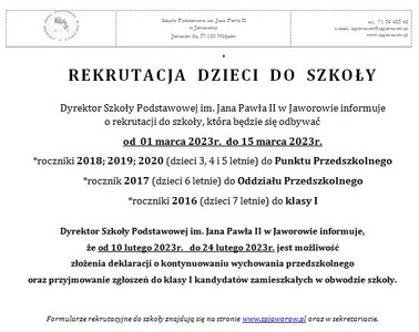 Rekrutacja do szkoły oraz Punktu Przedszkolnego...